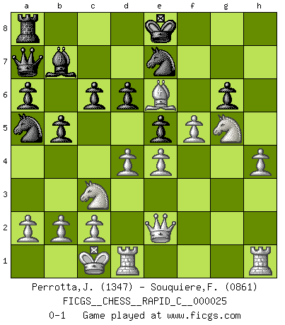Last move : 0-1 2007 May 17 9:43:20 [Event "FICGS__CHESS__RAPID_C__000025"] [Site "FICGS"] [Date "2007.03.20"] [Round "1"] [White "Perrotta,John Zach"] [Black "Souquiere,Florence"] [Result "0-1"] [WhiteElo "1347"] [BlackElo "0861"] 1.e4 Nc6 2.Nc3 f6 3.Bc4 e5 4.f4 b6 5.Nf3 Nge7 6.d3 Bb7 7.Be3 d6 8.f5 g6 9.fxg6 hxg6 10.Qe2 Na5 11.Be6 a6 12.O-O-O Bh6 13.Bxh6 Rxh6 14.d4 f5 15.Ng5 Rh5 16.Nf7 Qb8 17.g4 Rg5 18.Nxg5 Qa7 19.gxf5 c6 20.h4 b5 0-1 This chess game has been lost on time (started : 2007.03.20 1:50:59) KP : Nimzovich defense Queenside Castling by player White (move 12) Player Black won this chess game. Follow this game move after move (download)The hardest game to win is a won game. (Emanuel Lasker) Ich bin es gewohnt, das die Jugend mir überhaupt keinen Respekt entgegenbringt. (Alexander Morozewich) Las piezas de Ajedrez son los bloques del alfabeto que moldean los pensamientos; y esos pensamientos, aunque hagan un diseño visual en el tablero, expresan abstractamente su belleza como un poema. (Marcel Duchamp) Les échecs sont un jeu terrible. Si vous n'avez pas le centre, votre adversaire a une position plus libre. Par contre, si vous avez le centre, alors vous avez vraiment quelque chose pour laquelle vous inquiéter ! (Siegbert Tarrasch) Warrior pose battles inner weakness and wins focus. You see that there is no war within you. You're on your own side, and you are your own strength. (Terri Guillemets)