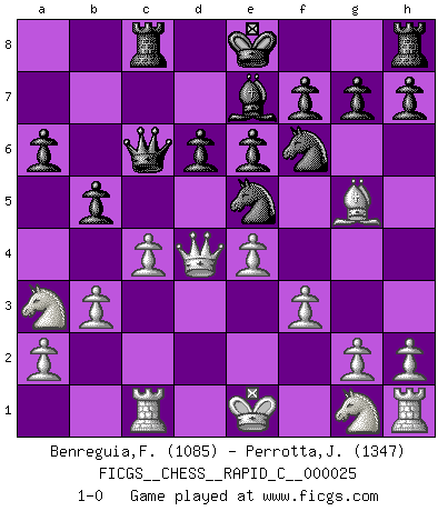 Last move : 1-0 2007 May 22 10:34:45 [Event "FICGS__CHESS__RAPID_C__000025"] [Site "FICGS"] [Date "2007.03.20"] [Round "1"] [White "Benreguia,Frederic"] [Black "Perrotta,John Zach"] [Result "1-0"] [WhiteElo "1085"] [BlackElo "1347"] 1.e4 c5 2.Bc4 e6 3.d4 cxd4 4.Qxd4 Nc6 5.Qd3 Ne5 6.Qd4 d6 7.Bb5+ Bd7 8.Bxd7+ Qxd7 9.Bd2 Nf6 10.c4 Rc8 11.Na3 a6 12.Rc1 Qc6 13.Bg5 b5 14.b3 Be7 15.f3 1-0 This chess game has been lost on time (started : 2007.03.20 1:50:59) Sicilian defense Player White won this chess game. Follow this game move after move (download)Chess is played with the mind and not with the hands ! (Renaud and Kahn) Ich verstehe Aljechins Kombinationen ganz gut; aber woher er diese Angriffschancen bekommt und wie er die Eröffnung behandelt das ist für mich ein Buch mit sieben Siegeln. (Rudolf Spielmann) El ganar no lo es todo... pero el perder es nada. (Mednis) Le plus grand jeu de l'esprit jamais inventé, plus vous l'apprenez, plus vous y prenez du plaisir. (Garry Kasparov) How many people work in NATO Headquarters ? - About half of them. (Dirk Stikker, NATO general secretary)