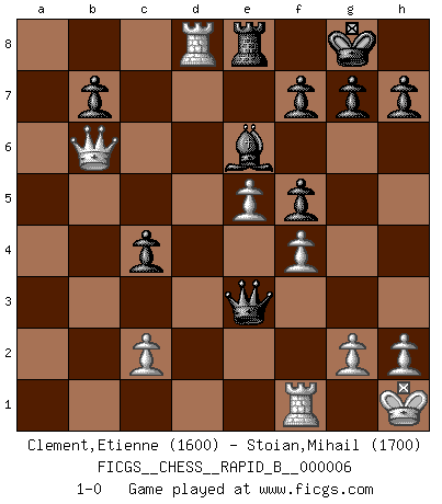 Last move : 1-0 2006 July 11 16:52:18 [Event "FICGS__CHESS__RAPID_B__000006"] [Site "FICGS"] [Date "2006.05.31"] [Round "1"] [White "Clement,Etienne"] [Black "Stoian,Mihail"] [Result "1-0"] [WhiteElo "1600"] [BlackElo "1700"] 1.e4 e6 2.d4 d5 3.Nc3 Bb4 4.e5 Ne7 5.Nge2 c5 6.a3 cxd4 7.axb4 dxc3 8.bxc3 Qc7 9.f4 O-O 10.Qd3 Nd7 11.Nd4 Nb6 12.Be2 Bd7 13.O-O Nc4 14.Qg3 Nf5 15.Nxf5 exf5 16.Be3 a6 17.Bc5 Rfe8 18.Rad1 Be6 19.Bxc4 dxc4 20.Rd6 a5 21.Bb6 Qc8 22.bxa5 Rxa5 23.Bxa5 Qc5+ 24.Qf2 Qxa5 25.Qb6 Qxc3 26.Rd8 Qe3 27.Kh1 1-0 French : Winawer, Advance variation Kingside Castling by player Black (move 9) Kingside Castling by player White (move 13) Player White won this chess game. Follow this game move after move (download)A Chess game is divided into three stages: the first, when you hope you have the advantage, the second when you believe you have an advantage, and the third... when you know you're going to lose ! (Savielly Tartakower) Ich las kürzlich ein Buch von Nietzsche. Er sagte Religion verdumme nur die Menschen. Ich stimme zu. (Robert James Fischer) Algunos sacrificios son sólidos, los demás son míos. (Mikhail Tal) J'apprécie les joueurs d'est-indienne, c'est grâce à eux que je nourris ma famille depuis tant d'années. (Petrosian) Never risk one's whole fortune unless supported by one's entire army. (Niccolo Machiavelli)