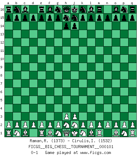 Last move : 0-1 2016 January 26 0:34:24 [Event "FICGS__BIG_CHESS__TOURNAMENT__000101"] [Site "FICGS"] [Date "2015.12.26"] [Round "1"] [White "Raman,Ranganathan"] [Black "Cirulis,Ilmars"] [Result "0-1"] [WhiteElo "1373"] [BlackElo "1532"] 0-1 This big chess game has been lost on time (started : 2015.12.26 17:15:7) Follow this game move after move (download)I like the moment when I break a man's ego. (Bobby Fischer) Jeder weiß, dass Gasprom Putins persönliches Machtinstrument ist. Die Firma wird vom Kreml aus geleitet und wird schon deshalb nie transparent sein. (Garry Kasparov) Juega la Apertura como un libro, el Juego Medio como un mago y los Finales como una máquina. (Spielmann) J'apprécie les joueurs d'est-indienne, c'est grâce à eux que je nourris ma famille depuis tant d'années. (Petrosian) All battles are fought by scared men who'd rather be someplace else. (John Wayne in the movie In harm's way)