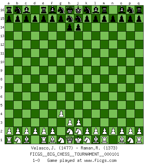 Last move : 1-0 2016 January 26 0:34:24 [Event "FICGS__BIG_CHESS__TOURNAMENT__000101"] [Site "FICGS"] [Date "2015.12.26"] [Round "1"] [White "Velasco,Jose Maria"] [Black "Raman,Ranganathan"] [Result "1-0"] [WhiteElo "1477"] [BlackElo "1373"] 1.g2-g4 1-0 This big chess game has been lost on time (started : 2015.12.26 17:15:7) Follow this game move after move (download)We must make sure that Chess will not be like a dead language, very interesting, but for a very small group. (Sytze Faber) Sie bekommen vielleicht den Eindruck, dass die Spitzenspieler überhaupt gar nicht so stark sind. Aber das stimmt nicht. Es ist eine Illusion. Mit einem Computer an der Seite ist es sehr leicht, Urteile zu fällen, aber wenn man alleine am Brett sitzt, sieht die Sache ganz anders aus. (Vladimir Kramnik) Aunque la mayoría de la gente disfruta observar las partidas de los grandes Maestros de ataque, algunos de los jugadores mas notables en la historia han sido los jugadores silenciosos posicionales. Lentamente ellos te aplastan despojandote de tu espacio, congestionando tus piezas y dejandote virtualmente sin nada que hacer. (Yasser Seirawan) La conception d'un plan est le processus par lequel un joueur exploite les avantages de sa position tout en s'efforçant d'en réduire au minimum les inconvénients. Afin de garantir le succès, un plan doit toujours se fonder sur un diagnostic objectif des particularités d'une position. La conception d'un plan est d'autant plus difficile que la position est équilibrée, et grandement facilitée lorsqu'il n'existe qu'un seul plan susceptible de répondre aux exigences de la position. (Harry Golombek) Computers have lots of memory but no imagination. (Anonymous)
