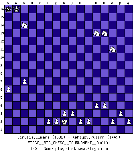 Last move : 1-0 2016 October 16 20:11:57 [Event "FICGS__BIG_CHESS__TOURNAMENT__000101"] [Site "FICGS"] [Date "2015.12.26"] [Round "1"] [White "Cirulis,Ilmars"] [Black "Kehayov,Yulian"] [Result "1-0"] [WhiteElo "1532"] [BlackElo "1449"] 1.j2-k4 j15-k13 2.h2-g4 h15-g13 3.p1-o3 h16-o10 4.n2-n4 e15-e13 5.e2-e4 d15-d13 6.d2-d4 m15-m13 7.c1-g5 n15-n13 8.o1-d11 e13-e12 9.d11-b13 c16-d15 10.b13-d15 b16-d15 11.h1-n6 o10-m12 12.n6-d15 f16-d14 13.d15-f13 k16-h15 14.f13-d13 a16-b16 15.d13-d5 o16-h10 16.m2-m4 l16-o13 17.e1-e3 g16-j15 18.d5-e5 m12-e5 19.g4-e5 e16-e13 20.b1-c3 p16-o14 21.p2-p3 p15-p14 22.q1-n1 h15-j13 23.m1-m3 b16-e16 24.a1-d1 e13-f13 25.e3-f3 f13-f3 26.g1-f3 e16-e13 27.f1-e2 e13-b13 28.e5-d3 j15-h13 29.m3-l3 m16-m14 30.l1-p5 h13-j11 31.b2-b3 q16-m16 32.d3-c5 b13-b9 33.f3-e5 m14-l14 34.l3-l14 j13-l14 35.d1-d3 l14-j13 36.e2-g4 b9-g9 37.g5-j7 g9-a9 38.j7-d12 a9-a12 39.d12-g15 j16-j15 40.g15-c11 m16-m14 41.g4-h5 m14-l14 42.h5-a12 l14-l8 43.a12-h5 l8-o8 44.k1-m2 h10-c5 45.d4-c5 o8-c8 46.c11-g7 c8-c5 47.b3-b4 c5-c7 48.g7-n13 o14-n12 49.n13-k10 j13-l12 50.k10-f6 c7-b7 51.a2-a3 b7-a7 52.c3-b5 a7-b7 53.c2-c4 b7-b6 54.e5-d7 b6-b7 55.h5-d9 b7-b9 56.d9-c8 b9-g9 57.j1-h2 g9-l9 58.p5-l9 d14-f12 59.d7-f8 b15-b14 60.f8-e10 f12-d14 61.e10-d12 d14-e13 62.d12-c14 e13-f12 63.c14-a15 f12-d14 64.a15-b13 d14-e13 65.d3-d15 c15-c13 66.b13-d14 e13-d14 67.d15-d14 b14-b13 68.n1-d1 n12-m14 69.d1-d13 o13-e4 70.d13-c13 j15-k14 71.f6-d8 k14-l14 72.c13-b13 e4-h7 73.b13-b7 h7-l10 74.b7-q7 q15-q13 75.d14-d16 l10-k11 76.c4-c5 k11-l10 77.c5-c6 l10-m11 78.q7-a7 m11-e4 79.c6-c7 e4-n12 80.b5-d4 n12-l10 81.b4-b5 l10-o13 82.b5-b6 o13-l10 83.b6-b7 l10-n12 84.c8-f5 n12-o11 85.b7-b8 o11-m9 86.a3-a4 m9-p12 87.a4-a5 p12-m9 88.a7-a9 m9-o11 89.a5-a6 o11-m9 90.l9-j11 k13-j11 91.a9-m9 j11-k13 92.f5-d7 l14-l13 93.d8-e7 l13-k14 94.m9-m13 k14-l14 95.m13-m14 l12-m14 96.d7-k13 m14-k13 97.d16-o16 o15-o13 98.o16-o14 l14-m13 99.o14-p14 q13-q12 100.e7-n15 q12-q11 101.p14-q14 q11-q10 102.q14-q10 o13-o12 103.n15-p13 o12-o11 104.q10-o10 m13-l12 105.o10-o11 l12-k12 106.o11-o12 k12-j13 107.o12-o13 j13-h13 108.p13-l9 f15-f14 109.o13-k13 j14-k13 110.l9-g13 h14-g13 111.m2-l4 f14-f13 112.o3-n5 l15-l14 113.d4-e6 k15-k14 114.k4-j6 k13-k12 115.l4-k6 l14-l13 116.n5-l6 h13-j13 117.e6-f8 j13-h13 118.j6-h8 h13-j13 119.h8-g10 j13-h13 120.k6-h7 h13-j13 121.l6-m8 j13-h13 122.m8-k9 h13-j13 123.k9-m10 j13-h13 124.h7-j9 h13-j13 125.m10-l12 j13-j14 126.j9-h11 g13-g12 127.h11-f12 j14-k13 128.l12-k10 k13-j14 129.f8-e10 j14-h14 130.e10-g11 h14-j14 131.g11-f13 j14-k13 132.f13-h12 k13-j13 133.k10-l12 j13-j12 134.l12-k14 j12-j13 135.k14-l12 j13-j12 136.f12-g14 j12-h13 137.g14-e13 h13-h14 138.e13-g12 h14-h13 139.g12-f14 h13-h14 140.f14-e12 h14-h13 141.l12-n13 h13-j12 142.n13-m15 l13-l12 143.m15-k14 j12-j13 144.k14-l12 j13-j12 145.e12-g13 j12-h13 146.h12-j14 h13-g12 147.g13-h15 k12-k11 148.h15-j13 g12-h13 149.j14-l13 h13-g13 150.l13-k11 g13-h13 151.j13-h11 h13-j12 152.h11-j13 j12-k12 153.l12-k10 k12-l11 154.k10-h11 l11-m11 155.g10-j9 m11-l11 156.k11-h12 l11-m12 157.h12-j14 m12-l11 158.j14-l13 l11-m12 159.l13-k11 m12-l11 160.k11-l9 l11-m10 161.j13-k11 m10-l11 162.j9-g10 l11-l12 163.g10-j11 l12-l11 164.h11-j13 l11-k12 165.j11-k9 k12-j12 166.l9-j10 j12-k13 167.k9-l11 k13-j14 168.j10-g11 j14-h14 169.j13-h11 h14-j14 170.b8-b9 j14-h14 171.k11-h12 h14-j15 172.l11-j12 j15-k15 173.h11-k12 k15-j15 174.g11-h13 j15-k15 175.h12-k13 k15-l16 176.j12-l13 l16-m16 177.h13-k14 m16-n16 178.k12-m13 n16-o15 179.k13-m12 o15-p14 180.k14-l12 p14-p13 181.l12-n13 p13-q12 182.l13-n12 q12-q11 183.m12-o11 q11-p10 184.n12-m10 p10-o10 185.b9-b10 o10-n10 186.b10-b11 n10-m9 187.b11-b12 m9-l10 188.b12-b13 l10-k10 189.b13-b14 k10-j11 190.b14-b15 j11-h10 191.b15-b16Q h10-g10 192.m10-k9 g10-h9 193.b16-h10 h9-g8 194.h10-h8 g8-f9 195.k9-j11 f9-e10 196.h8-g9 e10-f11 197.g9-g10 f11-e11 198.j11-g12 e11-f12 199.g12-h10 f12-e11 200.g10-f11 e11-d12 201.h10-f9 d12-e13 202.f9-d10 e13-d12 203.d10-b11 d12-c12 204.f11-e11 c12-d13 205.b11-d10 d13-d14 206.e11-e12 d14-c13 207.d10-b11 c13-d14 208.e12-f13 d14-c14 209.f13-e13 c14-b14 210.e13-c13 b14-b15 211.b11-d12 b15-a14 212.c13-b13 a14-a15 213.d12-c14 a15-a16 214.b13-b16 1-0 Follow this game move after move (download)Bobby Fischer's current state of mind is indeed a tragedy. One of the world's greatest Chess players - the pride and sorrow of American Chess. (Frank Brady) Strategie ist, wie man ein Mädchen auf den Rücksitz bekommt. Taktik ist, was man tut, wenn man dann dort ist. (Anonymous) Una de estas pequeñas movidas modestas pudieran ser mas molestas a tu oponente que la amenaza mas grande. (Siegbert Tarrasch) RxDa4 pat (...) When you have everything, sometimes it feels like nothing. (Horatio Caine, C.S.I. Miami)