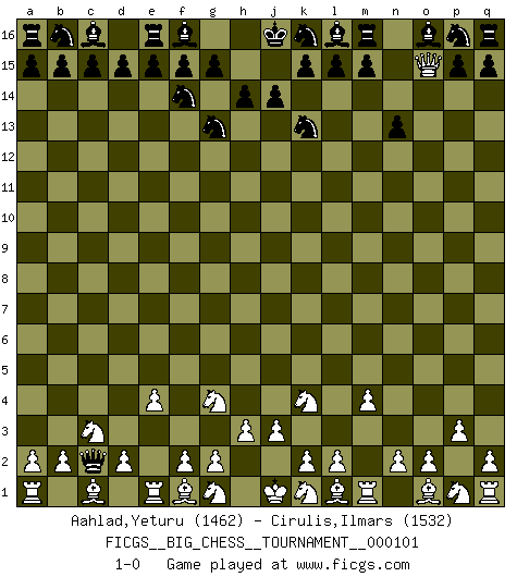 Last move : 1-0 2016 January 15 19:14:24 [Event "FICGS__BIG_CHESS__TOURNAMENT__000101"] [Site "FICGS"] [Date "2015.12.26"] [Round "1"] [White "Aahlad,Yeturu"] [Black "Cirulis,Ilmars"] [Result "1-0"] [WhiteElo "1462"] [BlackElo "1532"] 1.m2-m4 j15-k13 2.j2-k4 h15-g13 3.e2-e4 n15-n13 4.h1-o7 g16-f14 5.o7-o15 h16-l13 6.p2-p3 l13-c5 7.h2-g4 c5-c2 8.b1-c3 1-0 Follow this game move after move (download)Chess, like any creative activity, can exist only through the combined efforts of those who have creative talent, and those who have the ability to organize their creative work. (Mikhail Botvinnik) Frage des Reporters: -Worin besteht das Ziel von Gambiteröffnungen? Antwort: -Auf Kosten der Partie einen Ruf als Angriffspieler zu erwerben.- (Siegbert Tarrasch) Al jugar al Ajedrez entonces, podemos aprender: Primero: Previsión... Segundo: Prudencia... Tercero: Cautela... Y al final, aprendemos del Ajedrez el hábito de no ser desanimados por apariencias malas presentes en el estado de nuestros asuntos, el hábito de la esperanza por una oportunidad favorable y la perseveración de los secretos de los recursos. (Benjamin Franklin) La guerre est enfant de la passion, la passion est enfant du narcissisme et le narcissisme est l'enfant. (...) Une autre partie ? (Thibault de Vassal) Perception is reality. (Immanuel Kant)