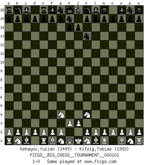 Last move : 1-0 2016 January 28 0:53:38 [Event "FICGS__BIG_CHESS__TOURNAMENT__000101"] [Site "FICGS"] [Date "2015.12.26"] [Round "1"] [White "Kehayov,Yulian"] [Black "Kitzig,Tobias"] [Result "1-0"] [WhiteElo "1449"] [BlackElo "1303"] 1.j2-k4 j15-k13 2.h2-g4 1-0 This big chess game has been lost on time (started : 2015.12.26 17:15:7) Follow this game move after move (download)If you aren't afraid of Spassky, then I have removed the element of money. (Jim Slater) Wenn sie aufgeben, dann danke ich Ihnen für das Spiel (Eventualzug beim Fernschach). (Anonymous) La pasion por jugar al Ajedrez es una de las mas inexplicables en el mundo. (H.G. Wells) Vouloir jouer aux échecs contre soi-même est aussi paradoxal que vouloir marcher sur son ombre. (Stefan Zweig) A government big enough to give you everything you want is strong enough to take everything you have. (Thomas Jefferson)