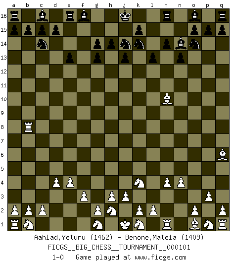 Last move : 1-0 2016 March 4 17:35:57 [Event "FICGS__BIG_CHESS__TOURNAMENT__000101"] [Site "FICGS"] [Date "2015.12.26"] [Round "1"] [White "Aahlad,Yeturu"] [Black "Benone,Mateia"] [Result "1-0"] [WhiteElo "1462"] [BlackElo "1409"] 1.m2-m4 g15-g13 2.j2-k4 j15-h13 3.e2-e4 e15-e13 4.h1-o7 p16-o14 5.f1-a6 g16-f14 6.p2-p3 b16-c14 7.d2-d4 m15-m14 8.c1-m10 n15-n13 9.l1-q6 j14-j13 10.a6-h13 f14-h13 11.o7-h13 h16-f14 12.f2-f3 h15-k14 13.h13-l10 l15-l13 14.e1-e3 f14-g14 15.l10-g14 f15-g14 16.e3-b3 l16-n14 17.b3-b8 k16-j14 18.n2-n4 1-0 This big chess game has been lost on time (started : 2015.12.26 17:15:7) Follow this game move after move (download)A Chess game is a dialogue, a conversation between a player and his opponent. Each move by the opponent may contain threats or be a blunder, but a player cannot defend against threats or take advantage of blunders if he does not first ask himself: What is my opponent planning after each move ? (Bruce A. Moon) Er war ein guter Schachspieler, aber ich kann Leute nicht ausstehen, die 'Heil Hitler' rufen (Über Alexander Aljechin). (Miguel Najdorf) Sin errores no puede haber brillantez. (Emanuel Lasker) Votre prénom est 'Tactique', votre deuxième prénom est 'Tactique' et votre nom est 'Tactique'. (Ken Smith) He is a liar. I just don't know what the lie is yet. (Horatio Caine, C.S.I. Miami)