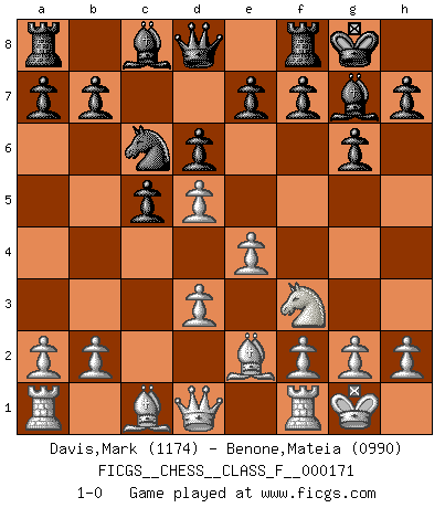 Last move : 1-0 2016 February 27 16:37:50 [Event "FICGS__CHESS__CLASS_F__000171"] [Site "FICGS"] [Date "2015.12.30"] [Round "1"] [White "Davis,Mark"] [Black "Benone,Mateia"] [Result "1-0"] [WhiteElo "1174"] [BlackElo "0990"] 1.e4 c5 2.Nf3 Nc6 3.c4 g6 4.Nc3 Bg7 5.Be2 Nf6 6.d3 O-O 7.O-O d6 8.Nd5 Nxd5 9.cxd5 1-0 This chess game has been lost on time (started : 2015.12.30 17:58:16) Sicilian defense Kingside Castling by player Black (move 6) Kingside Castling by player White (move 7) Player White won this chess game. Follow this game move after move (download)Chess is a fairy tale of 1001 blunders. (Savielly Tartakower) Wenn ich gewinne bin ich ein Genie. Wenn nicht, dann bin ich keines. (Robert James Fischer) El Ajedrez no es como la vida... ¡tiene reglas!. (Mark Pasternak) Votre seul travail dans les ouvertures est d'obtenir un milieu de partie jouable. (Lajos Portish) Establishing goals is all right if you don't let them deprive you of interesting detours. (Doug Larson)
