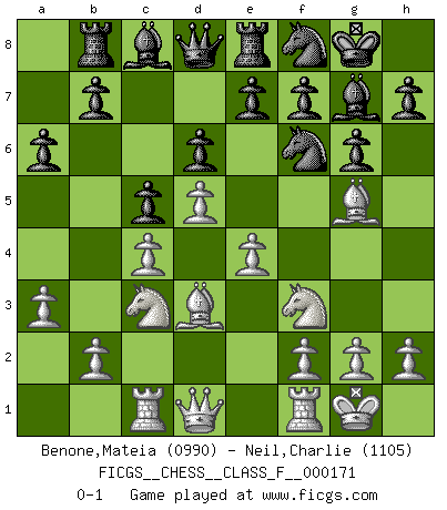 Last move : 0-1 2016 April 6 20:47:34 [Event "FICGS__CHESS__CLASS_F__000171"] [Site "FICGS"] [Date "2015.12.30"] [Round "1"] [White "Benone,Mateia"] [Black "Neil,Charlie"] [Result "0-1"] [WhiteElo "0990"] [BlackElo "1105"] 1.Nf3 Nf6 2.c4 d6 3.d4 g6 4.Nc3 Bg7 5.e4 O-O 6.Bd3 c5 7.d5 a6 8.O-O Nbd7 9.Bg5 Re8 10.a3 Rb8 11.Rc1 Nf8 0-1 This chess game has been lost on time (started : 2015.12.30 17:58:16) Reti Opening Kingside Castling by player Black (move 5) Kingside Castling by player White (move 8) Player Black won this chess game. Follow this game move after move (download)Capture of the adverse King is the ultimate but not the first object of the game. (William Steinitz) Die Auseinandersetzung mit Karpow war politisch geprägt. Er stand für das kommunistische System, wurde von dessen Repräsentanten gehätschelt. Ich war der Oppositionelle. Jeder Schachweltmeister spiegelt auch die gesellschaftlichen Verhältnisse wider. Kramnik steht für die Börsen-Generation des Neuen Markts, ideologiefrei, zahlenfixiert. (Garry Kasparov) En el Ajedrez, cuando menos, el valiente hereda la tierra. (Edmar Mednis) Un journaliste : 'Vous préférez avoir une dame de plus sur l'échiquier ou au lit ?' Boris Spassky : 'Ca dépend de la position.' Animated gif is worth one mega-word. (Unknown)