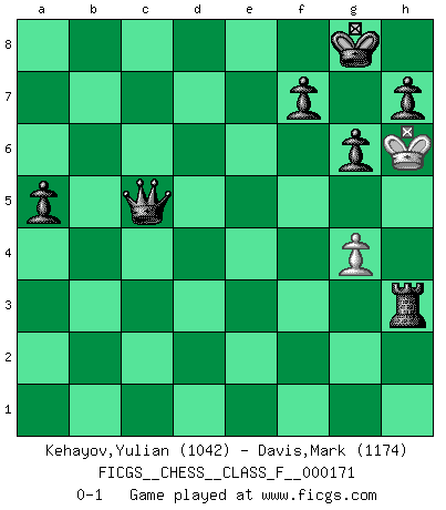 Last move : 0-1 2016 August 3 2:50:20 [Event "FICGS__CHESS__CLASS_F__000171"] [Site "FICGS"] [Date "2015.12.30"] [Round "1"] [White "Kehayov,Yulian"] [Black "Davis,Mark"] [Result "0-1"] [WhiteElo "1042"] [BlackElo "1174"] 1.e4 e5 2.Nf3 Nc6 3.d4 exd4 4.Nxd4 g6 5.Nxc6 bxc6 6.Nc3 Bg7 7.Bd2 d5 8.exd5 cxd5 9.Be2 Nf6 10.O-O O-O 11.Bf3 Be6 12.Be3 c6 13.Na4 Nd7 14.Nc5 Bxb2 15.Rb1 Bg7 16.Nxd7 Qxd7 17.Qe2 Rfe8 18.Qd3 Bf5 19.Qd2 a5 20.Rfc1 Rab8 21.Qe2 d4 22.Rd1 c5 23.c3 Rxb1 24.Rxb1 Bxb1 25.cxd4 Bxd4 26.g3 Bxe3 27.fxe3 Bd3 28.Qb2 Rxe3 29.Qb8+ Re8 30.Qf4 Re1+ 31.Kf2 Rf1+ 32.Kg2 Qd4 33.Qxd4 cxd4 34.a4 Ra1 35.Bc6 Bf1+ 36.Kf2 d3 37.Bb5 d2 38.Bxf1 d1Q 39.Be2 Qg1+ 40.Kf3 Ra3+ 41.Kg4 Rxa4+ 42.Kf3 Qh1+ 43.Kf2 Qxh2+ 44.Kf3 Qh5+ 45.Kf2 Qf5+ 46.Ke3 Qe4+ 47.Kf2 Ra2 48.g4 Qxe2+ 49.Kg3 Ra3+ 50.Kh4 Qf2+ 51.Kg5 Qc5+ 52.Kh6 Rh3+ 0-1 Scotch game Kingside Castling by player White (move 10) Kingside Castling by player Black (move 10) Promotion Queen by player Black (move 38) 10 pieces endgame at move 43 : White KBP , Black KQRPPPP WHITE : King + 1 Bishop 1 Pawn BLACK : King + 1 Queen 1 Rook 4 Pawns 9 pieces endgame at move 48 : White KP , Black KQRPPPP WHITE : King + 1 Pawn BLACK : King + 1 Queen 1 Rook 4 Pawns Player Black won this chess game. Follow this game move after move (download)When you don't know what to play, wait for an idea to come into your opponent's mind. You may be sure that idea will be wrong. (Siegbert Tarrasch) Ich hatte Angst gegen einen russischen Großmeister zu verlieren, und er befürchtete gegen einen kleinen Jungen zu verlieren. (über ein Remis gegen Juri Awerbach). (Robert James Fischer) Solo existe una cosa que Fischer hace en el Ajedrez sin placer: ¡perder!. (Boris Spassky) Le pion, dans sa simplicité, marche droit devant lui, mais lorsqu'il prend, il le fait obliquement? Ainsi l'homme, tant qu'il reste pauvre, marche dans la droiture et vit honnêtement, mais lorsqu'il recherche les honneurs, il flatte, se parjure et, par les voies obliques, cherche une position supérieure sur l'échiquier du monde. (Jean de Galles) Creativity is allowing yourself to make mistakes. Art is knowing which ones to keep. (Scott Adams)
