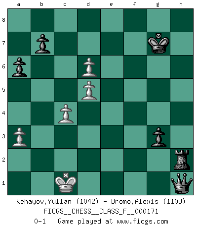 Last move : 0-1 2016 May 30 12:19:43 [Event "FICGS__CHESS__CLASS_F__000171"] [Site "FICGS"] [Date "2015.12.30"] [Round "1"] [White "Kehayov,Yulian"] [Black "Bromo,Alexis"] [Result "0-1"] [WhiteElo "1042"] [BlackElo "1109"] 1.e4 e5 2.Nf3 Nc6 3.d4 d6 4.d5 Nce7 5.Be2 h6 6.O-O a6 7.c4 Nf6 8.Nc3 c6 9.b3 Ng6 10.Be3 Be7 11.h3 O-O 12.g4 Nf4 13.Bd3 Nxh3+ 14.Kg2 Bxg4 15.Be2 Nf4+ 16.Bxf4 exf4 17.Nh2 Bxe2 18.Qxe2 c5 19.f3 Nh5 20.Rg1 Bh4 21.Nf1 Qd7 22.Kh1 Qh3+ 23.Qh2 Qxh2+ 24.Nxh2 g5 25.Ng4 Kg7 26.Kg2 Rae8 27.Rgf1 f5 28.exf5 Rxf5 29.Ne4 Ng3 30.Nxg3 Bxg3 31.Rab1 Re2+ 32.Rf2 Bxf2 33.Nxf2 h5 34.Ra1 g4 35.fxg4 hxg4 36.Kf1 f3 37.a3 g3 38.Nh3 Rh5 39.Re1 Rxe1+ 40.Kxe1 Rxh3 41.b4 Rh1+ 42.Kd2 f2 43.bxc5 f1Q 44.cxd6 Qf3 45.Kc2 Rh2+ 46.Kc1 Qh1+ 0-1 Scotch Opening Kingside Castling by player White (move 6) Kingside Castling by player Black (move 11) Promotion Queen by player Black (move 43) Player Black won this chess game. Follow this game move after move (download)In Chess, just as in life, today's bliss may be tomorrow's poison. (Assaic) Mit sehr nachdenklichem Gesicht schreitet Bobby durch den Turniersaal. Was ist passiert?, fragt Lombardy. Ich stehe schlecht, antwortet Fischer. Lombardy: Dann biete doch einfach Remis an. Fischer: So schlecht stehe ich nun auch wieder nicht! (Robert James Fischer) Con el tiempo, empecé a progresar en partidas decisivas. Tal vez porque me di cuenta de una simple verdad: no solo estaba yo nervioso sino también mi oponente. (Mikhail Tal) Même un GMI sait rarement calculer sur plus de cinq coups une attaque à sacrifices. (Rudolf Spielmann) For a mechanic, you seem to do an excessive amount of thinking. (C-3PO in Star Wars ep.2)