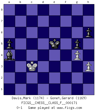 Last move : 0-1 2016 March 30 6:20:42 [Event "FICGS__CHESS__CLASS_F__000171"] [Site "FICGS"] [Date "2015.12.30"] [Round "1"] [White "Davis,Mark"] [Black "Gonet,Gerard"] [Result "0-1"] [WhiteElo "1174"] [BlackElo "1169"] 1.e4 e5 2.Nf3 f5 3.d3 Nf6 4.Nc3 Nc6 5.Bg5 Be7 6.Be2 O-O 7.O-O h6 8.Bd2 fxe4 9.dxe4 d5 10.exd5 Nxd5 11.Nxd5 Qxd5 12.b3 Be6 13.Rc1 Kh8 14.Bc4 Qd7 15.Bb5 a6 16.Bxc6 Qxc6 17.Nxe5 Qe8 18.Re1 Bf5 19.Bc3 Bf6 20.Nf3 Qc6 21.Bxf6 Qxf6 22.Ne5 Rae8 23.Nd3 Rd8 24.Qf3 b6 25.Re3 Qg6 26.Nf4 Qg5 27.Re5 Bg4 28.Qe3 Qxf4 29.Qxf4 Rxf4 30.g3 Rf3 31.Rce1 Kh7 32.Re7 Rd2 33.R7e2 Rxe2 34.Rxe2 Rxg3+ 35.fxg3 Bxe2 36.Kf2 Bd1 37.c3 c5 38.Ke3 Bc2 39.Kd2 Bb1 40.a3 Kg6 41.Ke3 Kf5 42.h3 g5 43.g4+ Ke5 44.a4 Be4 45.b4 cxb4 46.cxb4 a5 47.bxa5 bxa5 48.Kd2 Bc6 49.Kc3 Bxa4 0-1 Latvian counter-gambit Kingside Castling by player Black (move 6) Kingside Castling by player White (move 7) 10 pieces endgame at move 47 : White KPPPP , Black KBPPP WHITE : King + 4 Pawns BLACK : King + 1 Bishop 3 Pawns 9 pieces endgame at move 47 : White KPPP , Black KBPPP WHITE : King + 3 Pawns BLACK : King + 1 Bishop 3 Pawns 8 pieces endgame at move 49 : White KPP , Black KBPPP WHITE : King + 2 Pawns BLACK : King + 1 Bishop 3 Pawns Player Black won this chess game. Follow this game move after move (download)When in doubt... play Chess ! (Tevis) Gewinnen beim Schach fördert das Selbstvertrauen. Beim Sex spüre ich sowas nicht... (Garry Kasparov) Muchos se han convertido en Maestros de Ajedrez, nadie se ha convertido en el Maestro del Ajedrez. (Siegbert Tarrasch) La vérité est comme le meilleur coup aux échecs : elle existe, mais il faut la chercher. (Arturo Perez-Reverte) Plans are ideas that never come to fruition. (Daniel Parmet)