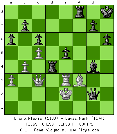 Last move : 0-1 2016 August 25 20:51:43 [Event "FICGS__CHESS__CLASS_F__000171"] [Site "FICGS"] [Date "2015.12.30"] [Round "1"] [White "Bromo,Alexis"] [Black "Davis,Mark"] [Result "0-1"] [WhiteElo "1109"] [BlackElo "1174"] 1.d4 d5 2.c4 c6 3.Nc3 Nf6 4.Nf3 e6 5.Bg5 Be7 6.h3 O-O 7.e3 Nbd7 8.Bd3 Re8 9.O-O h6 10.Bxf6 Nxf6 11.a3 Bd7 12.Re1 Qc7 13.c5 a6 14.e4 dxe4 15.Nxe4 Nxe4 16.Bxe4 Qf4 17.Bd3 Bf6 18.Bc4 Rad8 19.b4 Bc8 20.Qc2 Bxd4 21.Nxd4 Rxd4 22.Bd3 f5 23.g3 Qf3 24.Re3 Qh5 25.Rae1 Qxh3 26.Qc3 Rg4 27.Bc4 f4 28.Rf3 Kh8 29.Re4 fxg3 30.fxg3 Rxe4 31.Bf1 Qg4 32.Kg2 e5 33.Bd3 Rd4 34.Be2 Qh3+ 35.Kf2 Bg4 36.Re3 Qh2+ 37.Kf1 Qh1+ 38.Kf2 Rf8+ 39.Bf3 Qh2+ 40.Ke1 Qxg3+ 41.Ke2 Qg2+ 0-1 QGD Slav defense Kingside Castling by player Black (move 6) Kingside Castling by player White (move 9) Player Black won this chess game. Follow this game move after move (download)If your opponent offers you a draw, try to work out why he thinks he's worse off. (Nigel Short) Nach Morphy wurde nichts neues mehr in der Behandlung offener Positionen gefunden. (Mikhail Moiseyevich Botvinik) Debes de llevar a tu oponente hacia un profundo y obscuro bosque donde 2+2=5, y el camino que conduce a la salida es suficientemente ancho para solamente uno. (Mikhail Tal) Nous sommes les pions de la mystérieuse partie d'Echecs jouée par Dieu. Il nous déplace, nous arrête, nous pousse encore, puis nous lance un à un dans la boîte du Néant. Epitaphe sur la tombe de David Janowsky (1868-1927). But they are useless. They can only give you answers. (Pablo Picasso, about computers)
