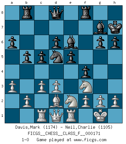 Last move : 1-0 2016 July 27 4:6:52 [Event "FICGS__CHESS__CLASS_F__000171"] [Site "FICGS"] [Date "2015.12.30"] [Round "1"] [White "Davis,Mark"] [Black "Neil,Charlie"] [Result "1-0"] [WhiteElo "1174"] [BlackElo "1105"] 1.e4 e6 2.Nc3 c5 3.Nf3 Nc6 4.Bc4 Nge7 5.O-O g6 6.d3 Bg7 7.Nb5 O-O 8.Bf4 e5 9.Be3 d6 10.Bg5 a6 11.Nc3 h6 12.Bd2 b5 13.Bd5 Rb8 14.Re1 Nxd5 15.exd5 Ne7 16.a3 Bb7 17.Ne2 Bxd5 18.Nc3 Be6 19.Rc1 Kh7 20.Ne4 f5 21.Ng3 Nd5 22.Ne2 f4 23.c3 1-0 French defense Kingside Castling by player White (move 5) Kingside Castling by player Black (move 7) Player White won this chess game. Follow this game move after move (download)There is no remorse like the remorse of Chess. (H. G. Wells) Wir können eben der zündenden Macht des Opfers nicht wiederstehen, denn die Begeisterung für das Opfer liegt in der Natur des Menschen. (Rudolf Spielmann) Yo siempre he tenido un ligero sentimiento de lástima por una persona que no tiene conocimiento del Ajedrez. (Siegbert Tarrasch) Je crois qu'il existe des manières très spécifiques de jouer efficacement contre une machine. Evidemment, nous n'avons aucune chance en technique pure, parce que l'ordinateur calcule de manière parfaite. Mais lorsque nous faisons appel à notre cerveau, en utilisant l'intuition et la compréhension, alors nous restons beaucoup plus forts. (Anatoli Karpov) 98% of all statistics are made up. (Author unknown)