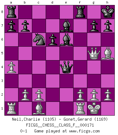 Last move : 0-1 2016 January 7 20:20:18 [Event "FICGS__CHESS__CLASS_F__000171"] [Site "FICGS"] [Date "2015.12.30"] [Round "1"] [White "Neil,Charlie"] [Black "Gonet,Gerard"] [Result "0-1"] [WhiteElo "1105"] [BlackElo "1169"] 1.e4 e5 2.Nf3 f5 3.Nxe5 Qf6 4.d4 d6 5.Nc4 fxe4 6.Nc3 Qg6 7.Be2 Nf6 8.Ne3 c6 9.O-O Be7 10.d5 O-O 11.a4 cxd5 12.Nexd5 Nxd5 13.Qxd5+ Kh8 14.Nxe4 Nc6 15.Bh5 Be6 16.Qg5 Qxe4 0-1 Latvian counter-gambit Kingside Castling by player White (move 9) Kingside Castling by player Black (move 10) Player Black won this chess game. Follow this game move after move (download)He who takes the Queen's Knight's Pawn will sleep in the streets. (Anonymous) Über Karpov: Er war und ist ein Vertreter der russischen Reaktionäre. Das steckt tief in seiner Seele, wehalb ich nicht nett mit ihm umgehen kann. (Viktor Kortschnoi) ¿Porque tengo que perder ante este idiota?. (Aron Nimzovich) C'est une question de caractère, Beaucoup de gens perdent leur motivation très vite. D'autres, ils sont rares, peuvent la conserver très longtemps. J'aime les échecs, encore aujourd'hui je suis heureux d'analyser des parties. J'aime toujours gagner, je déteste encore perdre. Bien jouer est important pour mon intégrité intellectuelle et morale. Et puis les échecs vivent en ce moment une période historique grâce à Internet. Ils se développent dans les systèmes éducatifs à travers le monde. Ils sortent de leur ghetto, et c'est mon rôle de mener à bien cette révolution. (Gary Kasparov) It's unlucky to be superstitious. (Dave Enteles)