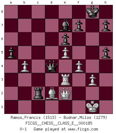 Last move : 0-1 2016 February 25 16:38:7 [Event "FICGS__CHESS__CLASS_E__000185"] [Site "FICGS"] [Date "2015.12.31"] [Round "1"] [White "Ramos,Francis"] [Black "Budnar,Milos"] [Result "0-1"] [WhiteElo "1513"] [BlackElo "1279"] 1.d4 d5 2.c4 c6 3.Nc3 Nf6 4.e3 a6 5.Nf3 b5 6.cxd5 Nxd5 7.Bd3 Bg4 8.O-O e6 9.e4 Nxc3 10.bxc3 Bxf3 11.Qxf3 Be7 12.Rd1 O-O 13.e5 Nd7 14.Qxc6 Nb6 15.Qe4 g6 16.g3 Na4 17.Bd2 Rc8 18.Rac1 Nb2 19.Re1 Nxd3 20.Qxd3 Rc4 21.h4 Qd5 22.h5 Ra4 23.Rc2 Rxa2 24.Re3 Rxc2 25.Qxc2 a5 26.f4 Rc8 27.Qb1 gxh5 28.Qd1 b4 29.cxb4 Qxd4 30.Qe2 Rc2 0-1 QGD Slav defense Kingside Castling by player White (move 8) Kingside Castling by player Black (move 12) Player Black won this chess game. Follow this game move after move (download)The mistakes are there, waiting to be made. (Savielly Tartakower) Wenn du nicht weißt was du tun sollst, warte bis dein Gegner eine Idee hat. Sie wird sicher schlecht sein. (Siegbert Tarrasch) El Ajedrez es en su esencia, un juego. En su forma, un arte. Y en su ejecución, una ciencia. (Baron Tassilo) Karpov est une pièce de musée. (Garry Kasparov) The Movers & Shakers of this world are those who play chess in the mornings and go to the disco in the evenings. (Dinesh De Silva)