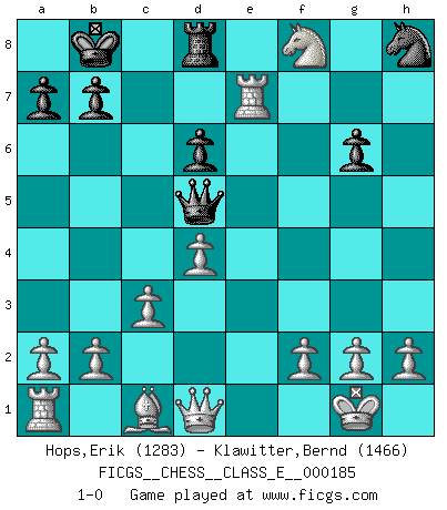 Last move : 1-0 2016 January 29 23:0:8 [Event "FICGS__CHESS__CLASS_E__000185"] [Site "FICGS"] [Date "2015.12.31"] [Round "1"] [White "Hops,Erik"] [Black "Klawitter,Bernd"] [Result "1-0"] [WhiteElo "1283"] [BlackElo "1466"] 1.e4 Nf6 2.e5 Nd5 3.d4 d6 4.Nf3 g6 5.Bc4 Nb6 6.Bb3 Bg4 7.Bxf7+ Kd7 8.exd6 cxd6 9.Ne5+ Kc7 10.Nxg4 Bg7 11.Be6 Nc6 12.c3 Rf8 13.O-O Qe8 14.Nd2 Nd8 15.Bb3 Nf7 16.Re1 Rd8 17.Ne4 Kb8 18.Nef6 Bxf6 19.Nxf6 Qc6 20.Rxe7 Nh8 21.Nxh7 Nd5 22.Bxd5 Qxd5 23.Nxf8 1-0 Alekhine's defense : Modern, Fianchetto variation Kingside Castling by player White (move 13) Player White won this chess game. Follow this game move after move (download)Do you realize Fischer almost never has any bad pieces? He exchanges them, and the bad pieces remain with his opponents. (Yuri Balashov) Ich erzeugte keinen Neid, da mich die Schachspieler als Musiker und die Musiker als Schachspieler betrachteten. (Mark Taimanov) Todavía soy una víctima del Ajedrez. Tiene toda la belleza del arte y mucho mas. No puede ser comercializado. El Ajedrez es mas puro que el arte en su posición social. (Marcel Duchamp) Même un GMI sait rarement calculer sur plus de cinq coups une attaque à sacrifices. (Rudolf Spielmann) You lose, general Kenobi. (General Grievous in Star Wars ep.3)