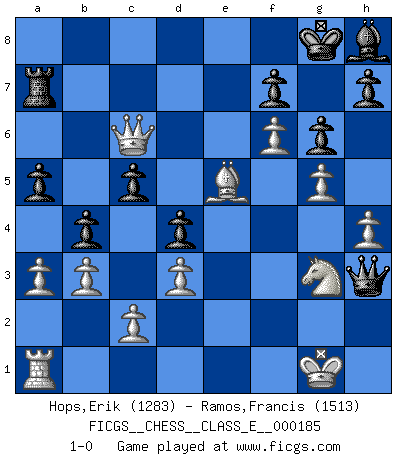 Last move : 1-0 2016 January 25 14:4:7 [Event "FICGS__CHESS__CLASS_E__000185"] [Site "FICGS"] [Date "2015.12.31"] [Round "1"] [White "Hops,Erik"] [Black "Ramos,Francis"] [Result "1-0"] [WhiteElo "1283"] [BlackElo "1513"] 1.e4 c5 2.Nc3 d6 3.g3 Nc6 4.Bg2 Nf6 5.Nge2 g6 6.O-O Bg7 7.d3 O-O 8.h3 Rb8 9.f4 Nd4 10.g4 b5 11.Ng3 e5 12.f5 b4 13.Nce2 Bb7 14.g5 Nd7 15.f6 Bh8 16.Nxd4 exd4 17.Bf4 Ne5 18.a3 a5 19.b3 Re8 20.h4 d5 21.Re1 dxe4 22.Bxe4 Qd7 23.Bxb7 Rxb7 24.Rxe5 Rxe5 25.Bxe5 Qh3 26.Qf3 Ra7 27.Qc6 1-0 Sicilian : Closed Kingside Castling by player White (move 6) Kingside Castling by player Black (move 7) Player White won this chess game. Follow this game move after move (download)The older I grow, the more I value pawns. (Paul Keres) Ich verstehe mehr vom Schach als irgendein anderer lebender Meister. (José Raúl Capablanca) El Ajedrez demanda una total concentración. (Bobby Fischer) Même si l'adversaire joue le coup analysé précédemment, recommencez l'analyse en voyant la nouvelle position. Première règle de Blumenfeld The beginning is the most important part of the work. (Plato)