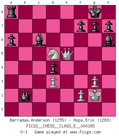 Last move : 0-1 2016 January 23 16:9:25 [Event "FICGS__CHESS__CLASS_E__000185"] [Site "FICGS"] [Date "2015.12.31"] [Round "1"] [White "Barradas,Anderson"] [Black "Hops,Erik"] [Result "0-1"] [WhiteElo "1295"] [BlackElo "1283"] 1.e4 e5 2.Nf3 Nc6 3.Bb5 a6 4.Ba4 Nf6 5.O-O Be7 6.Re1 b5 7.Bb3 O-O 8.d3 d6 9.Bg5 Na5 10.Bxf6 Bxf6 11.Nc3 c6 12.a4 Nxb3 13.cxb3 Bd7 14.h3 Qb6 15.Nh2 bxa4 16.Nxa4 Qb4 17.Nf1 Bg5 18.Nc3 Be6 19.Ra3 Rfb8 20.g3 Bxb3 21.Qg4 Bh6 22.Qe2 Be6 23.Rb1 Bxh3 24.Nd2 d5 25.Ra4 Qd6 26.exd5 cxd5 27.Nf1 Bd7 28.Ra5 Bc6 29.Nd2 Qb4 30.Ra2 d4 31.Ra4 Bxa4 32.Nd5 Qxd2 33.Qxe5 Rxb2 34.Rxb2 Qxb2 35.Kg2 Bc6 0-1 Ruy Lopez : Closed, 7...O-O Kingside Castling by player White (move 5) Kingside Castling by player Black (move 7) Player Black won this chess game. Follow this game move after move (download)Fischer is the strongest player in the world. In fact, the strongest player who ever lived. (Larry Evans) Im Reiche der Wirklichkeit ist man nie so glücklich wie im Reiche der Gedanken. (Arthur Schopenhauer) Hoy en día, si tu no eres un Gran Maestro a los 14 años, es mejor que lo olvides. (Anand Viswanathan) On croit qu'il y a plus de mauvais joueurs que de bons joueurs, c'est faux : Il y a autant de joueurs qui gagnent que de joueurs qui perdent. (Philippe Geluck) If you know the enemy and know yourself you need not fear the results of a hundred battles. (Sun Tzu)