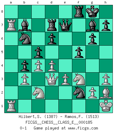 Last move : 0-1 2016 January 18 15:12:8 [Event "FICGS__CHESS__CLASS_E__000185"] [Site "FICGS"] [Date "2015.12.31"] [Round "1"] [White "Hilbert,Stephan J."] [Black "Ramos,Francis"] [Result "0-1"] [WhiteElo "1387"] [BlackElo "1513"] 1.d4 Nf6 2.Bf4 d6 3.e3 g6 4.Nf3 Bg7 5.Bd3 O-O 6.c3 Qe8 7.O-O Nbd7 8.h3 e5 9.Bh2 e4 10.Bxe4 Nxe4 11.Na3 a6 12.Nc2 b5 13.Qd3 Bb7 14.Nb4 a5 15.Nc2 Nb6 16.Rfe1 Rd8 17.b3 c5 18.c4 b4 19.a3 f5 20.axb4 axb4 21.Ra7 Rd7 22.Rea1 Qe7 23.Kh1 Nxf2+ 0-1 Queen's pawn game Kingside Castling by player Black (move 5) Kingside Castling by player White (move 7) Player Black won this chess game. Follow this game move after move (download)It is peculiar but a fact nevertheless, that gamblers in chess always have enthusiastic followers. (Botvinnik) Ich hatte meine größten Erfolge, als ich 47 Jahre alt war. Kasparow war noch nicht mal 42 und hat das Schach schon im Stich gelassen. (Viktor Kortschnoi) Con o sin el título, Bobby Fischer fue sin lugar a dudas el mas grande jugador de su época. (Burt Hochberg) Mon pion favori sur ma case favorite ! Bronstein en parlant d'un coup de pion en h5 quand il avait les Noirs. Perseverance does not equal worthiness. Next time you want to get my attention, wear something fun. Low-riding jeans are hot. (Gregory House, House M.D.)