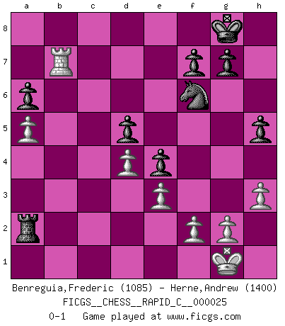 Last move : 0-1 2007 May 13 20:21:10 [Event "FICGS__CHESS__RAPID_C__000025"] [Site "FICGS"] [Date "2007.03.20"] [Round "1"] [White "Benreguia,Frederic"] [Black "Herne,Andrew"] [Result "0-1"] [WhiteElo "1085"] [BlackElo "1400"] 1.Nf3 c5 2.Nc3 d5 3.e3 Nf6 4.Bb5+ Bd7 5.Bxd7+ Nbxd7 6.O-O e5 7.d4 e4 8.Ne5 c4 9.Nxd7 Qxd7 10.a4 h5 11.b3 Rc8 12.bxc4 Rxc4 13.Bd2 Bb4 14.Nb5 Bxd2 15.Qxd2 a6 16.Nc3 Qc7 17.Ra3 O-O 18.h3 Rc8 19.a5 Rxc3 20.Rxc3 Qxc3 21.Qxc3 Rxc3 22.Rb1 Rxc2 23.Rxb7 Ra2 0-1 Reti Opening Kingside Castling by player White (move 6) Kingside Castling by player Black (move 17) Player Black won this chess game. Follow this game move after move (download)Chess is a matter of delicate judgment, knowing when to punch and how to duck. (Bobby Fischer) Dieses schreckliche Gefühl, dass ich gegen eine Maschine spielte, die niemals Fehler macht, zerschmetterte meinen Widerstand. (Mark Taimanov) Observen a Garry Kasparov. Después de una derrota, invariablemente el gana la próxima partida. Prácticamente hace pedazos a su siguiente oponente. Eso es algo que tenemos que aprender a lograr. (Maurice Ashley) Le jeu d'échecs fait naître et fortifie en nous plusieurs qualités précieuses dans le cours de l'existence, telles que la prévoyance, la circonspection, la prudence, et la persévérance. (Benjamin Franklin - 1783, la morale des échecs) I can't decide which is riskier; taking crazy risks, or taking advice on crazy risks from a crazy risk taker. (Gregory House in House M.D.)