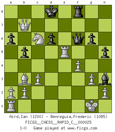 Last move : 1-0 2007 April 30 23:31:9 [Event "FICGS__CHESS__RAPID_C__000025"] [Site "FICGS"] [Date "2007.03.20"] [Round "1"] [White "Aird,Ian"] [Black "Benreguia,Frederic"] [Result "1-0"] [WhiteElo "1200"] [BlackElo "1085"] 1.e4 e5 2.Nf3 Bd6 3.d4 Qf6 4.Nc3 Ne7 5.Bg5 Qg6 6.Bxe7 Bxe7 7.Nxe5 Qe6 8.Bc4 Qb6 9.Bxf7+ Kd8 10.Bb3 Rf8 11.Nd5 Qa5+ 12.c3 d6 13.Nc4 Qb5 14.O-O g6 15.Nxe7 Kxe7 16.Re1 Qg5 17.d5 Bh3 18.g3 b5 19.Na5 Qf6 20.f4 h5 21.e5 dxe5 22.Rxe5+ Kd7 23.d6 cxd6 24.Qd5 a6 25.Qb7+ Kd8 26.Qxa8 Kd7 27.Qb7+ Kd8 28.Qxb8+ Kd7 29.Qb7+ Kd8 30.Nc6+ 1-0 King's knight Opening Kingside Castling by player White (move 14) Player White won this chess game. Follow this game move after move (download)Not all artists are Chess players, but all Chess players are artists. (Marcel Duchamp) Im Leben werden Partien nie so unstrittig gewonnen wie im Spiel (Emanuel Lasker) No existe un remordimiento como el remordimiento del Ajedrez. (H. G. Wells) J'ai vu le vaincu d'Echecs jouer des années durant dans l'espoir de la fête de la victoire. Car tu es plus riche de ce qu'elle existe si même elle n'est point pour toi. Ainsi de la perle du fond des mers. (Antoine de Saint-Exupéry) If I had no sense of humor, I would long ago have committed suicide. (Mahatma Gandhi)