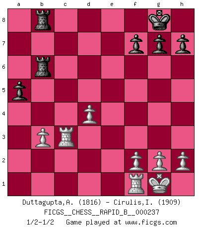 Last move : 1/2-1/2 2016 February 18 5:48:53 [Event "FICGS__CHESS__RAPID_B__000237"] [Site "FICGS"] [Date "2016.01.02"] [Round "1"] [White "Duttagupta,Aniruddha"] [Black "Cirulis,Ilmars"] [Result "1/2-1/2"] [WhiteElo "1816"] [BlackElo "1909"] 1.c4 a6 2.Nf3 e6 3.Nc3 d5 4.e3 c5 5.d4 Nf6 6.cxd5 exd5 7.Be2 c4 8.O-O b5 9.b3 Bb7 10.Qc2 b4 11.Na4 c3 12.a3 a5 13.Ne5 Nbd7 14.Bb5 Ba6 15.Bxa6 Rxa6 16.Qe2 Qc8 17.e4 dxe4 18.Nxd7 Nxd7 19.Qxe4+ Re6 20.Qf3 Be7 21.axb4 Bxb4 22.Bf4 O-O 23.Rac1 Qa8 24.Qxa8 Rxa8 25.Nxc3 Nf6 26.Bc7 Bxc3 27.Rxc3 Nd5 28.Rc5 Nxc7 29.Rxc7 Rb6 30.Rc3 Rab8 1/2-1/2 English Opening Kingside Castling by player White (move 8) Kingside Castling by player Black (move 22) This chess game ended in a draw. Follow this game move after move (download)Chess is above all, a fight ! (Emanuel Lasker) Die Elozahlen sind sehr schlecht für das Schach. Jetzt ist Schach eine Sportindustrie, die darauf zielt Elopunkte zu machen. (Miguel Najdorf) Debemos de asegurarnos de que el Ajedrez no se convierta en un lenguaje muerto, muy interesante, pero solo para un grupo muy pequeño. (Sytze Faber) On n'a jamais que l'âge auquel on a commence à jouer aux échecs car après on cesse de vieillir. (Capablanca) Good luck. You're gonna need it. (Han Solo in Star Wars ep.6)