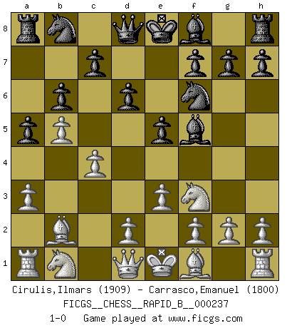 Last move : 1-0 2016 February 12 2:42:30 [Event "FICGS__CHESS__RAPID_B__000237"] [Site "FICGS"] [Date "2016.01.02"] [Round "1"] [White "Cirulis,Ilmars"] [Black "Carrasco,Emanuel"] [Result "1-0"] [WhiteElo "1909"] [BlackElo "1800"] 1.b4 Nf6 2.a3 e5 3.Bb2 d6 4.c4 Bf5 5.e3 a5 6.b5 b6 7.Nf3 1-0 This chess game has been lost on time (started : 2016.01.02 4:51:46) Polish (Sokolsky) opening Player White won this chess game. Follow this game move after move (download)Pawn endings are to Chess what putting is to golf. (Cecil Purdy) Über Frauen: Chess is better. (Robert James Fischer) Bobby Fischer es el mas grande genio de Ajedrez de todos los tiempos. (Alexander Kotov) Il n'y a plus de joueurs du niveau de Jacob Murray dont la seule quête est le beau jeu, le plaisir de voir les pièces construire quelque chose. Sur 10 idées à la minute, 9 seront sans intérêt, la dernière s'avèrera géniale. (Christian Bauer) Never was anything great achieved without danger. (Niccolo Machiavelli)