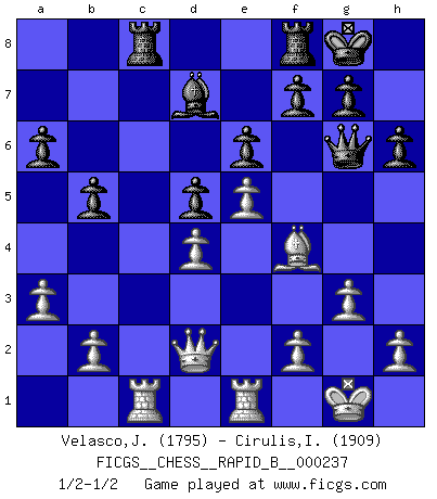 Last move : 1/2-1/2 2016 January 11 0:22:20 [Event "FICGS__CHESS__RAPID_B__000237"] [Site "FICGS"] [Date "2016.01.02"] [Round "1"] [White "Velasco,Jose Maria"] [Black "Cirulis,Ilmars"] [Result "1/2-1/2"] [WhiteElo "1795"] [BlackElo "1909"] 1.d4 a6 2.e4 e6 3.Nf3 d5 4.Nc3 Nf6 5.e5 Nfd7 6.Bd3 c5 7.dxc5 Bxc5 8.O-O Nc6 9.Bf4 h6 10.Bg3 O-O 11.a3 b5 12.Re1 Ba7 13.Ne2 Nc5 14.c3 Nxd3 15.Qxd3 Bd7 16.Bf4 Rc8 17.Nfd4 Qh4 18.g3 Qg4 19.Nxc6 Bxc6 20.Nd4 Bxd4 21.cxd4 Bd7 22.Rac1 Qg6 23.Qd2 1/2-1/2 Queen's pawn Kingside Castling by player White (move 8) Kingside Castling by player Black (move 10) This chess game ended in a draw. Follow this game move after move (download)Chess makes man wiser and clear-sighted. (Vladimir Putin) Rauchen ist dem Schachspieler bei seiner Arbeit, also im Wettkampf, untersagt. (Viktor Kortschnoi) El Ajedrez es imaginación. (David Bronstein) Un millionnaire : 'Monsieur Steinitz ! Vous ne participez aux tournois que pour l'argent, alors que moi je n'y viens que pour l'honneur.' Steinitz : 'Chacun joue pour ce qu'il n'a pas'... If you work for a living, why do you kill yourself working ? (Tuco to a chicken in The Good, The Bad and The Ugly)