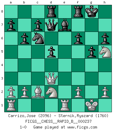 Last move : 1-0 2016 January 23 9:45:51 [Event "FICGS__CHESS__RAPID_B__000237"] [Site "FICGS"] [Date "2016.01.02"] [Round "1"] [White "Carrizo,Jose"] [Black "Sternik,Ryszard"] [Result "1-0"] [WhiteElo "2096"] [BlackElo "1760"] 1.e4 e6 2.d4 d5 3.Nc3 Nf6 4.Bg5 dxe4 5.Nxe4 Be7 6.Bxf6 Bxf6 7.Nf3 O-O 8.Qd2 Be7 9.Bd3 Nc6 10.c3 b6 11.O-O h6 12.Rfe1 Bb7 13.Bc2 Ba6 14.Qe3 Qd7 15.Ng3 Bc4 16.Nh5 Rad8 17.Nd2 Bd5 18.Qg3 g5 19.c4 Bxg2 20.d5 Bxd5 21.Qc3 f6 22.cxd5 exd5 23.Qd3 1-0 French : Burn variation Kingside Castling by player Black (move 7) Kingside Castling by player White (move 11) Player White won this chess game. Follow this game move after move (download)If you aren't afraid of Spassky, then I have removed the element of money. (Jim Slater) Gewöhnliche Menschen denken nur daran, wie sie ihre Zeit verbringen. Ein intelligenter Mensch versucht, sie auszunutzen. (Arthur Schopenhauer) En un gambito tu regalas un Peón por el bién de tomar un juego perdido. (Samuel Standige Boden) La vie est comme un jeu d'échecs : nous esquissons un plan, mais celui-ci est tributaire de ce que daignent faire l'adversaire aux échecs et le destin dans la vie. (Arthur Schopenhauer) Excelling at chess has long been considered a symbol of more general intelligence. That is an incorrect assumption in my view, as pleasant as it might be. But for the purposes of argument and investigation, chess is, in Russkin-Gutman's words, 'an unparalleled laboratory, since both the learning process and the degree of ability obtained can be objectified and quantified, providing an excellent comparative framework on which to use rigorous analytical techniques.' (The Chess Master and the Computer, by Garry Kasparov - 2010)