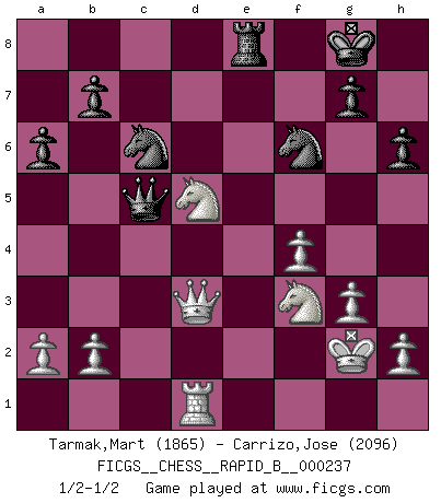 Last move : 1/2-1/2 2016 March 1 18:58:51 [Event "FICGS__CHESS__RAPID_B__000237"] [Site "FICGS"] [Date "2016.01.02"] [Round "1"] [White "Tarmak,Mart"] [Black "Carrizo,Jose"] [Result "1/2-1/2"] [WhiteElo "1865"] [BlackElo "2096"] 1.e4 e5 2.f4 Bc5 3.Nf3 d6 4.c3 Bb6 5.d4 exd4 6.cxd4 Bg4 7.Bb5+ c6 8.Be2 d5 9.e5 Ne7 10.Be3 Nd7 11.Nh4 Bxe2 12.Qxe2 c5 13.dxc5 Bxc5 14.Bxc5 Nxc5 15.Qb5+ Nd7 16.O-O O-O 17.Nc3 a6 18.Qe2 f6 19.Nf3 Qb6+ 20.Kh1 fxe5 21.Nxe5 Nf6 22.Rac1 Qd6 23.Rcd1 Rae8 24.Qd3 Rd8 25.Rfe1 Rfe8 26.g3 Nc6 27.Nf3 Qc5 28.Kg2 h6 29.Rxe8+ Rxe8 30.Nxd5 1/2-1/2 KGD : Classical, 4.c3 Kingside Castling by player White (move 16) Kingside Castling by player Black (move 16) This chess game ended in a draw. Follow this game move after move (download)A passed Pawn increases in strength as the number of pieces on the board diminishes. (Capablanca) Kasparov ist eine Art Monster mit hundert Augen, denen auch nicht das Geringste entgeht. (Tony Miles) Nunca nadie ha ganado una partida de Ajedrez rindiendose. (Unknown) L'action d'une oeuvre littéraire se déroule sur un champ de bataille. Les masques et les types du drame moderne correspondent aux pièces du jeu d'échecs. L'intrigue correspond aux coups et aux gambits, c'est à dire aux techniques du jeu telles qu'utilisées et interprétées par les joueurs. Les tactiques et les péripéties [mouvements] correspondent aux coups exécutés par l'adversaire. (Viktor Shklovsky) Those parts of the system that you can hit with a hammer (not advised) are called hardware; those program instructions that you can only curse at are called software. (Anonymous)