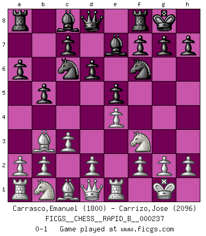 Last move : 0-1 2016 February 12 2:42:30 [Event "FICGS__CHESS__RAPID_B__000237"] [Site "FICGS"] [Date "2016.01.02"] [Round "1"] [White "Carrasco,Emanuel"] [Black "Carrizo,Jose"] [Result "0-1"] [WhiteElo "1800"] [BlackElo "2096"] 1.e4 e5 2.Nf3 Nc6 3.Bb5 a6 4.Ba4 Nf6 5.O-O Be7 6.Re1 b5 7.Bb3 d6 8.c3 O-O 0-1 This chess game has been lost on time (started : 2016.01.02 4:51:46) Ruy Lopez : Closed Kingside Castling by player White (move 5) Kingside Castling by player Black (move 8) Player Black won this chess game. Follow this game move after move (download)After a bad opening, there is hope for the middle game. After a bad middle game, there is hope for the endgame. But once you are in the endgame, the moment of truth has arrived. (Edmar Mednis) Die westlichen Werte sind eine Sprache, welche die Putin-Administration nicht versteht. (Garry Kasparov) Con el fin de mejorar tu juego, debes de estudiar los finales antes que todo, ya que mientras que los finales pueden ser estudiados y dominados por sí mismos, el juegomedio y la apertura deben de ser estudiados en relación con los finales. (José Raúl Capablanca) Mais n'est-ce pas déjà le limiter injurieusement que d'appeler les échecs un jeu? N'est-ce pas aussi une science, un art, ou quelque chose qui, comme le cercueil de Mahomet entre ciel et terre, est suspendu entre l'un et l'autre, et qui réunit un nombre incroyable de contraires ? (Stefan Zweig) Optimism is a variety of information deficit. Sometimes especially true for correspondence chess games. (Michael Aigner)