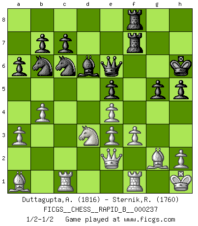 Last move : 1/2-1/2 2016 February 13 17:4:21 [Event "FICGS__CHESS__RAPID_B__000237"] [Site "FICGS"] [Date "2016.01.02"] [Round "1"] [White "Duttagupta,Aniruddha"] [Black "Sternik,Ryszard"] [Result "1/2-1/2"] [WhiteElo "1816"] [BlackElo "1760"] 1.c4 Nf6 2.g3 e5 3.Bg2 d5 4.cxd5 Nxd5 5.Nc3 Nb6 6.Nf3 Nc6 7.Rb1 Be7 8.O-O Be6 9.b4 a6 10.a3 f5 11.d3 O-O 12.Bb2 Qd7 13.Nd2 f4 14.Nf3 Bf5 15.Ne4 Bxe4 16.dxe4 Qe6 17.Rc1 Rad8 18.Qc2 g5 19.gxf4 Rxf4 20.Ne1 Rf6 21.Nd3 Rf7 22.f3 h5 23.Kh1 Kh7 24.Ba1 Bf8 25.Qc3 Bd6 26.e3 Rg8 27.Qc2 Kh6 28.Qe2 Rgf8 1/2-1/2 English, 1...Nf6 (Anglo-Indian defense) Kingside Castling by player White (move 8) Kingside Castling by player Black (move 11) This chess game ended in a draw. Follow this game move after move (download)I am still a victim of Chess. It has all the beauty of art and much more. It cannot be commercialized. Chess is much purer than art in its social position. (Marcel Duchamp) Ich hatte meine größten Erfolge, als ich 47 Jahre alt war. Kasparow war noch nicht mal 42 und hat das Schach schon im Stich gelassen. (Viktor Kortschnoi) No existe un remordimiento como el remordimiento del Ajedrez. (H. G. Wells) Les ravages du H expliquent la différence de niveau entre Tal et Thal [Abergel]. All art requires courage. (Anne Tucker)