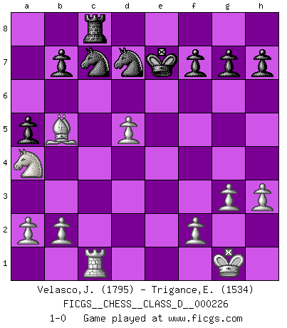 Last move : 1-0 2016 January 16 14:13:25 [Event "FICGS__CHESS__CLASS_D__000226"] [Site "FICGS"] [Date "2016.01.02"] [Round "1"] [White "Velasco,Jose Maria"] [Black "Trigance,Emile"] [Result "1-0"] [WhiteElo "1795"] [BlackElo "1534"] 1.d4 Nf6 2.c4 e6 3.Nf3 Bb4+ 4.Bd2 Qe7 5.g3 O-O 6.Bg2 Bxd2+ 7.Qxd2 d6 8.Nc3 e5 9.O-O Re8 10.e4 a5 11.h3 Na6 12.Rad1 c6 13.Rfe1 Nc7 14.Na4 Ra6 15.c5 Nd7 16.Bf1 Ra7 17.d5 cxd5 18.exd5 Rd8 19.Qe3 Ra8 20.cxd6 Qxd6 21.Nxe5 Re8 22.Nc4 Rxe3 23.Nxd6 Rxe1 24.Rxe1 Kf8 25.Nxc8 Rxc8 26.Rc1 Ke7 27.Bb5 1-0 Bogo-Indian defense, Nimzovich variation Kingside Castling by player Black (move 5) Kingside Castling by player White (move 9) Player White won this chess game. Follow this game move after move (download)The sign of a great Master is his ability to win a won game quickly and painlessly. (Irving Chernev) Der 70jährige Viktor Kortschnoi: Die Rentenanstalt wollte mich zwingen in Rente zu gehen. Meine Frau erhält jetzt eine Pension- und ich zahle weiter in die Rentenkasse ein! (Viktor Kortschnoi) No es suficiente ser un buen jugador, se debe también de jugar bién. (Siegbert Tarrasch) Les échecs sont un jeu par leur forme, un art par leur essence et une science par sa difficulté d'acquisition. Ils peuvent vous procurer autant de plaisir qu'un bon livre ou une belle musique, mais vous n'aurez une réelle joie que si vous arrivez à bien jouer. (Tigran Petrosian) There is far too much law for those who can afford it and far too little for those who cannot. (Derek Bok)