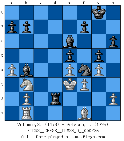 Last move : 0-1 2016 January 30 12:16:33 [Event "FICGS__CHESS__CLASS_D__000226"] [Site "FICGS"] [Date "2016.01.02"] [Round "1"] [White "Vollmer,Steve"] [Black "Velasco,Jose Maria"] [Result "0-1"] [WhiteElo "1473"] [BlackElo "1795"] 1.d4 Nf6 2.c4 e6 3.Nf3 d5 4.Bg5 Be7 5.e3 O-O 6.Bd3 dxc4 7.Bxc4 c5 8.O-O cxd4 9.Qxd4 h6 10.Bh4 Qxd4 11.Nxd4 g5 12.Bg3 Ne4 13.Bxb8 Rxb8 14.a4 Rd8 15.f3 Nd6 16.Be2 e5 17.Nb3 Be6 18.N1d2 Nf5 19.Kf2 Bb4 20.Rfd1 Rbc8 21.e4 Ne7 22.g4 Ng6 23.Ke3 Rc2 24.Rab1 Nf4 25.Bf1 Rcxd2 26.Rxd2 Rxd2 0-1 Queen's pawn game Kingside Castling by player Black (move 5) Kingside Castling by player White (move 8) Player Black won this chess game. Follow this game move after move (download)In Chess, at least, the brave inherit the earth. (Edmar Mednis) Je älter ich werde, um so mehr schätze ich die Bauern. (Paul Keres) Nunca nadie ha ganado una partida de Ajedrez rindiendose. (Unknown) Les Echecs ne sont pas pour les âmes timides. Ils requièrent un homme entier, qui ne s'arrête pas aveuglément à ce qui a été déjà établi, mais qui tente individuellement de sonder les profondeurs du jeu. (W. Steinitz) It is the aim of the modern school, not to treat every position according to one general law, but according to the principle inherent in the position. (Richard Reti)