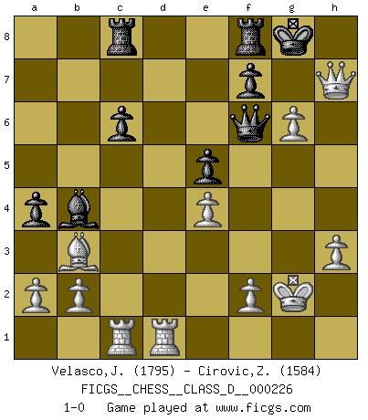 Last move : 1-0 2016 February 15 11:47:22 [Event "FICGS__CHESS__CLASS_D__000226"] [Site "FICGS"] [Date "2016.01.02"] [Round "1"] [White "Velasco,Jose Maria"] [Black "Cirovic,Zeljko"] [Result "1-0"] [WhiteElo "1795"] [BlackElo "1584"] 1.d4 d5 2.c4 c6 3.Nf3 dxc4 4.e3 Nf6 5.Bxc4 Bg4 6.Nc3 e6 7.h3 Bh5 8.g4 Bg6 9.Ne5 Bd6 10.Nxg6 hxg6 11.Qf3 g5 12.e4 e5 13.d5 Nbd7 14.dxc6 bxc6 15.Bxg5 Nb6 16.Bb3 a5 17.Na4 Bb4+ 18.Kf1 Nxa4 19.Bxa4 O-O 20.Kg2 Qd6 21.Rhd1 Qe6 22.Rac1 Rac8 23.Bb3 Qe8 24.Bxf6 gxf6 25.Qxf6 Qe7 26.Qg6+ Kh8 27.Qh6+ Kg8 28.g5 a4 29.g6 Qf6 30.Qh7+ 1-0 QGD Slav : 3.Nf3 Kingside Castling by player Black (move 19) Player White won this chess game. Follow this game move after move (download)You have to have the fighting spirit. You have to force moves and take chances. (Bobby Fischer) Der zweitbeste Zug ist oft der einzig richtige. (Savielly Grigorievitsch Tartakower) ¡Examina movidas que hagan daño! Un buen ojo for movidas desvastantes es mucho mas importante que el conocimiento de principios estratégicos. (Purdy) La victoire dans une partie d'Echecs appartient la plupart du temps à celui qui voit un peu plus loin que l'adversaire. (Lasker) Go and wake up your luck. (Persian saying)