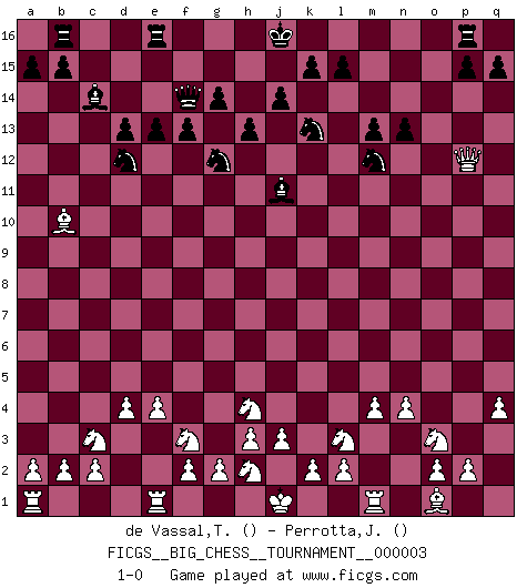 Last move : 1-0 2007 June 9 16:37:26 [Event "FICGS__BIG_CHESS__TOURNAMENT__000003"] [Site "FICGS"] [Date "2007.03.20"] [Round "1"] [White "de Vassal,Thibault"] [Black "Perrotta,John Zach"] [Result "1-0"] [WhiteElo ""] [BlackElo ""] 1.j2-h4 h15-j13 2.h1-o7 h14-h13 3.o7-o15 p16-o14 4.o15-f7 g16-f14 5.f7-c10 g15-g14 6.c10-c15 b16-c14 7.c15-l7 k16-l14 8.m2-m4 n15-n13 9.p1-o3 j15-k13 10.g1-f3 o16-j11 11.k1-l3 f14-g12 12.b1-c3 j13-k11 13.l7-p11 q16-p16 14.p11-k11 f16-k12 15.e2-e4 l14-m12 16.k11-f7 f15-f13 17.l1-p5 h16-f14 18.q2-q4 d15-d13 19.f1-c4 c16-e14 20.f7-b7 a16-b16 21.c4-p16 m16-p16 22.n2-n4 c14-d12 23.p5-j11 k12-j11 24.d2-d4 m15-m13 25.c1-g5 l16-n14 26.g5-b10 e14-d15 27.q1-q3 o14-p12 28.q3-p3 e15-e13 29.b7-k7 d15-c14 30.p3-p12 n14-p12 31.k7-p12 1-0 Follow this game move after move (download)Not only will I predict his triumph over Botvinnik, but I'll go further and say that he'll probably be the greatest Chess player that ever lived. (John Collins) Spiel ein langweiliges Spiel zu Ende und lustige Dinge können passieren. (Hans Ree) El Ajedrez tiene tanto misterio como las mujeres. (Purdy) Echiquier : carré parfait, comme la Jérusalem nouvelle décrite par l'auteur de l'Apocalypse, huit cases sur huit, exaltation du chiffre 4, symbole du cosmos aux quatre horizons... où le noir et le blanc, l'ombre et la lumière, le mal et le bien s'entremêlent et se conjuguent. (Robert Couffignal, Le Gambit du poète) God is an atheist. (Unknown)