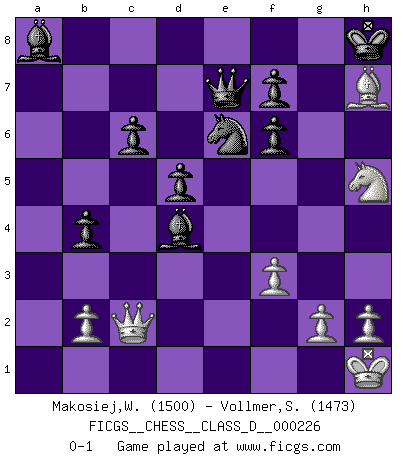 Last move : 0-1 2016 June 14 22:49:55 [Event "FICGS__CHESS__CLASS_D__000226"] [Site "FICGS"] [Date "2016.01.02"] [Round "1"] [White "Makosiej,Wladyslaw"] [Black "Vollmer,Steve"] [Result "0-1"] [WhiteElo "1500"] [BlackElo "1473"] 1.d4 d5 2.c4 e6 3.Nc3 Nf6 4.cxd5 exd5 5.Bg5 Nbd7 6.e3 Be7 7.Bd3 c6 8.Qc2 O-O 9.Nge2 b6 10.O-O Bb7 11.f3 h6 12.Bf4 Re8 13.Ng3 Nf8 14.Rad1 Ne6 15.Be5 b5 16.a3 a5 17.Nf5 Bf8 18.Ne2 b4 19.axb4 axb4 20.Ra1 Qd7 21.Bxf6 gxf6 22.Neg3 Rxa1 23.Rxa1 Ra8 24.Rxa8 Bxa8 25.Nxh6+ Bxh6 26.Nh5 Bxe3+ 27.Kh1 Bxd4 28.Bf5 Qe7 29.Bh7+ Kh8 0-1 This chess game has been lost on time (started : 2016.01.02 15:2:11) QGD : Exchange, positional line Kingside Castling by player Black (move 8) Kingside Castling by player White (move 10) Player Black won this chess game. Follow this game move after move (download)If your opponent cannot do anything active, then don't rush the position; instead you should let him sit there, suffer, and beg you for a draw. (Jeremy Silman) Er war ein guter Schachspieler, aber ich kann Leute nicht ausstehen, die 'Heil Hitler' rufen (Über Alexander Aljechin). (Miguel Najdorf) Yo creo que el Ajedrez posee una magia que es también una ayuda en la edad avanzada. Una rodilla reumática es olvidada durante una partida de Ajedrez y otros eventos pueden parecer algo sin importancia comparada a una catástrofe en el tablero de Ajedrez. (Vlastimil Hort) Pour se monter efficace, un Cavalier a besoin d'avant-postes ! Les Cavaliers font les meilleurs bloqueurs de pions passés. Once you start thinking you have nothing left to learn, you have everything to learn. (Steve Badget)