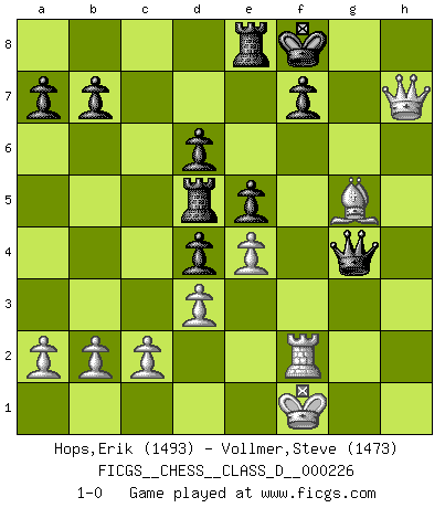 Last move : 1-0 2016 January 30 12:14:52 [Event "FICGS__CHESS__CLASS_D__000226"] [Site "FICGS"] [Date "2016.01.02"] [Round "1"] [White "Hops,Erik"] [Black "Vollmer,Steve"] [Result "1-0"] [WhiteElo "1493"] [BlackElo "1473"] 1.e4 c5 2.Nc3 Nc6 3.g3 Nf6 4.Bg2 d6 5.d3 g6 6.f4 Bg7 7.Nf3 O-O 8.O-O Bg4 9.h3 Bd7 10.g4 e5 11.f5 Nd4 12.g5 Nh5 13.f6 Bh8 14.Nd5 Re8 15.Nxd4 cxd4 16.Bf3 Bxh3 17.Bxh5 Bxf1 18.Kxf1 gxh5 19.Qxh5 Rc8 20.Bd2 Rc5 21.Ke2 Rxd5 22.Rh1 Bxf6 23.Qxh7+ Kf8 24.gxf6 Qxf6 25.Rf1 Qe6 26.Bg5 Qg4+ 27.Rf3 Qg2+ 28.Rf2 Qg4+ 29.Kf1 1-0 Sicilian : Closed Kingside Castling by player Black (move 7) Kingside Castling by player White (move 8) Player White won this chess game. Follow this game move after move (download)Alekhine is a poet who creates a work of art out of something that would hardly inspire another man to send home a picture post card. (Max Euwe) Ich glaube, ich kenne inzwischen die Gründe für mein Versagen: schachliche Charakterfehler. Ich war nie ein Wunderkind und in meiner gesamten menschlichen Entwicklung immer zu langsam. (Viktor Kortschnoi) Si el ingenio solamente fuese necesario para lucirse, las mujeres serían las mejores jugadoras de Ajedrez del mundo. (Albin) Seul un grand joueur sait à quel point il joue faiblement. (Xavier Tartacover) I'll be back. (Arnold Schwarzenegger)