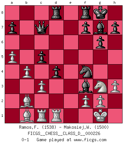 Last move : 0-1 2016 June 5 14:27:44 [Event "FICGS__CHESS__CLASS_D__000226"] [Site "FICGS"] [Date "2016.01.02"] [Round "1"] [White "Ramos,Francis"] [Black "Makosiej,Wladyslaw"] [Result "0-1"] [WhiteElo "1538"] [BlackElo "1500"] 1.e4 g6 2.d4 Bg7 3.Bc4 c5 4.Nf3 cxd4 5.Nxd4 Qa5+ 6.c3 Nf6 7.Qe2 d6 8.O-O O-O 9.b4 Qd8 10.Bb2 Nc6 11.Nxc6 bxc6 12.Rd1 Qb6 13.h3 Bb7 14.Nd2 Rad8 15.a4 Nh5 16.a5 Qc7 17.Nf1 e6 18.Rac1 d5 19.exd5 exd5 20.Bd3 Nf4 21.Qf3 c5 22.Bb1 d4 23.Ng3 Bxf3 0-1 Robatsch (Modern) defense Kingside Castling by player White (move 8) Kingside Castling by player Black (move 8) Player Black won this chess game. Follow this game move after move (download)In Chess, just as in life, today's bliss may be tomorrow's poison. (Assaic) Der Bart als Geschlechtszeichen mitten im Gesicht ist obszön. Daher gefällt er den Weibern. [Zugegeben, kein Schachzitat, aber unglaublich originell] (Arthur Schopenhauer) Un sacrificio se refuta mucho mejor al aceptarlo. (Wilhelm Steinitz) Les Echecs ont trois composantes : le temps, l'espace et le matériel en dernier. (Mikhail Tal) You must have a dream in order to have it come true. (A.P.J. Kalam)