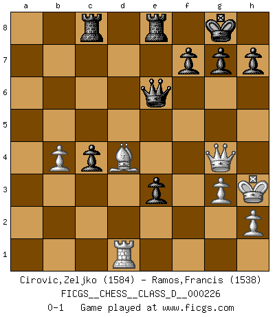 Last move : 0-1 2016 February 25 6:24:16 [Event "FICGS__CHESS__CLASS_D__000226"] [Site "FICGS"] [Date "2016.01.02"] [Round "1"] [White "Cirovic,Zeljko"] [Black "Ramos,Francis"] [Result "0-1"] [WhiteElo "1584"] [BlackElo "1538"] 1.e4 c5 2.Nf3 d6 3.d4 cxd4 4.Nxd4 Nf6 5.Nc3 a6 6.Be2 e6 7.O-O Be7 8.f4 Qc7 9.Be3 O-O 10.Bf3 Nc6 11.Nxc6 bxc6 12.Qd2 Bb7 13.a3 c5 14.Rad1 Rab8 15.Bf2 Rfe8 16.b3 c4 17.b4 Rbd8 18.Qe2 Rc8 19.e5 Bxf3 20.Qxf3 dxe5 21.fxe5 Qxe5 22.Bd4 Qc7 23.Ne4 e5 24.Nxf6+ Bxf6 25.Bc5 a5 26.Rd5 axb4 27.axb4 Qc6 28.Rfd1 Qa4 29.c3 e4 30.Qg4 Bxc3 31.Kf2 Bf6 32.Rf5 Qc2+ 33.Kg3 Be5+ 34.Kh3 Qc3+ 35.g3 e3 36.Rxe5 Qxe5 37.Bd4 Qe6 0-1 Sicilian : Najdorf, Opovcensky variation Kingside Castling by player White (move 7) Kingside Castling by player Black (move 9) Player Black won this chess game. Follow this game move after move (download)At this time Fischer is simply a level above all the best Chessplayers in the world. (John Jacobs) Ich bin stolz ein Bulgare zu sein. (Veselin Topalov) Cuando la partida de Ajedrez termina, el Peón y el Rey regresan a la misma caja. (Irish saying) L'ordinateur a tué l'originalité. Il n'y a plus guère d'aventures sur l'échiquier. (Jacob Murray) Strategy without tactics is the slowest route to victory. Tactics without strategy is the noise before defeat. (Sun Tzu)