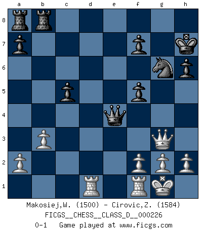 Last move : 0-1 2016 September 13 10:20:19 [Event "FICGS__CHESS__CLASS_D__000226"] [Site "FICGS"] [Date "2016.01.02"] [Round "1"] [White "Makosiej,Wladyslaw"] [Black "Cirovic,Zeljko"] [Result "0-1"] [WhiteElo "1500"] [BlackElo "1584"] 1.d4 d5 2.c4 dxc4 3.e4 c5 4.d5 e6 5.Bxc4 exd5 6.Bxd5 Be7 7.Qb3 Be6 8.Qxb7 Bxd5 9.exd5 Nd7 10.Nf3 Ngf6 11.O-O O-O 12.Nc3 Bd6 13.Bg5 h6 14.Bh4 Ne5 15.Nd2 Qa5 16.Qb5 Qc7 17.Bxf6 gxf6 18.Nce4 f5 19.Nxd6 Qxd6 20.Qb3 Rfb8 21.Qg3+ Kh7 22.b3 Qxd5 23.Rad1 Ng6 24.Ne4 Qxe4 0-1 This chess game has been lost on time (started : 2016.01.02 15:2:11) QGA : 3.e4 Kingside Castling by player White (move 11) Kingside Castling by player Black (move 11) Player Black won this chess game. Follow this game move after move (download)Methodical thinking is of more use in Chess than inspiration. (C. J. S. Purdy) Die westlichen Werte sind eine Sprache, welche die Putin-Administration nicht versteht. (Garry Kasparov) El Ajedrez es como la guerra en un tablero. (Bobby Fischer) 'L'échange des dames est un coup dur pour les deux adversaires...' Un journaliste lors d'une partie du match Spassky-Fischer It's not the size of the dog in the fight, it's the size of the fight in the dog. (Mark Twain)
