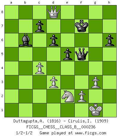 Last move : 1/2-1/2 2016 June 2 17:18:8 [Event "FICGS__CHESS__CLASS_B__000236"] [Site "FICGS"] [Date "2016.01.03"] [Round "1"] [White "Duttagupta,Aniruddha"] [Black "Cirulis,Ilmars"] [Result "1/2-1/2"] [WhiteElo "1816"] [BlackElo "1909"] 1.c4 a6 2.e4 Nc6 3.Nf3 e5 4.Nc3 Nf6 5.Be2 Bb4 6.Nd5 Bc5 7.d3 d6 8.Bg5 h6 9.Bxf6 gxf6 10.O-O f5 11.b4 Ba7 12.Rc1 Be6 13.exf5 Bxf5 14.b5 Ne7 15.bxa6 bxa6 16.Nh4 Bc8 17.Nc3 O-O 18.Bg4 f5 19.Bf3 Rb8 20.Qc2 Bd7 21.Rb1 Rxb1 22.Rxb1 Kh7 23.g3 Kg8 24.Qb3 Kg7 25.Qb7 Bd4 26.Ne2 Bb6 27.Qxa6 f4 28.Qb7 Bc8 29.Qa8 fxg3 30.hxg3 Ng6 31.Nxg6 Kxg6 32.a4 Qf6 33.a5 Bxa5 34.Be4+ Bf5 35.Rb8 Rxb8 36.Bxf5+ Qxf5 37.Qxb8 Kf7 38.Qd8 Bb6 1/2-1/2 English Opening Kingside Castling by player White (move 10) Kingside Castling by player Black (move 17) This chess game ended in a draw. Follow this game move after move (download)In life, as in Chess, one's own Pawns block one's way. A man's very wealth, ease, leisure, children, books, which should help him to win, more often checkmate him. (Charles Buxton) Unter Putin wird alles Geld aus Russland wie von einem Staubsauger nach Moskau umgeleitet, das ist wie ein schwarzes Loch. (Garry Kasparov) Los finales de Peón son del Ajedrez lo que el cesped es del Golf. (Cecil Purdy) Je menace de comprendre la position. (Anonyme) Over-the-board chess is the favorite of mortals, correspondence chess is the favorite of the gods. (Eduard Dyckhoff)