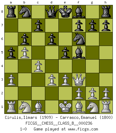 Last move : 1-0 2016 February 16 3:16:48 [Event "FICGS__CHESS__CLASS_B__000236"] [Site "FICGS"] [Date "2016.01.03"] [Round "1"] [White "Cirulis,Ilmars"] [Black "Carrasco,Emanuel"] [Result "1-0"] [WhiteElo "1909"] [BlackElo "1800"] 1.b4 Nf6 2.a3 e5 3.e3 d6 4.c4 Bf5 5.d3 a5 6.b5 b6 7.Qf3 1-0 This chess game has been lost on time (started : 2016.01.03 19:3:51) Polish (Sokolsky) opening Player White won this chess game. Follow this game move after move (download)Chess teaches you to control the initial excitement you feel when you see something that looks good and it trains you to think objectively when you're in trouble. (Stanley Kubrick) Capablanka war das größte Genie der Schachgeschichte! Aber denken sie nicht er habe nichts vom Schach verstanden. Er wusste nur soviel wie er wissen musste um seine Ziele zu erreichen. (Mikhail Moiseyevich Botvinik) Peones: ellos son el alma de esta partida, solos forman el ataque y la defensa. (Philidor) Aucun coup ne doit être joué sans but. (Pedro Damiano) A proverb is a short sentence based on long experience. (Miguel de Cervantes)