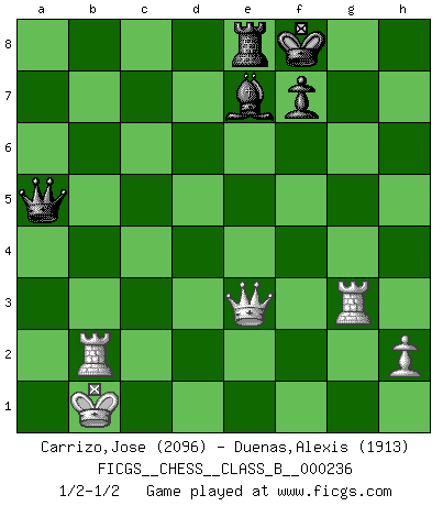 Last move : 1/2-1/2 2016 January 23 15:25:44 [Event "FICGS__CHESS__CLASS_B__000236"] [Site "FICGS"] [Date "2016.01.03"] [Round "1"] [White "Carrizo,Jose"] [Black "Duenas,Alexis"] [Result "1/2-1/2"] [WhiteElo "2096"] [BlackElo "1913"] 1.e4 c5 2.Nf3 d6 3.d4 cxd4 4.Nxd4 Nf6 5.Nc3 a6 6.Be3 e5 7.Nb3 Be6 8.f3 Be7 9.Qd2 O-O 10.O-O-O Nbd7 11.g4 b5 12.g5 b4 13.Ne2 Ne8 14.f4 a5 15.f5 a4 16.Nbd4 exd4 17.Nxd4 b3 18.Kb1 bxc2+ 19.Nxc2 Bb3 20.axb3 axb3 21.Na3 Ne5 22.Qg2 Qb8 23.Bf4 Ra4 24.f6 Bd8 25.Bxe5 dxe5 26.Bb5 Rxa3 27.bxa3 Nd6 28.fxg7 Kxg7 29.Ba6 Qb6 30.Qb2 Qxa6 31.Qxe5+ Kg8 32.Qxd6 Qe2 33.Qd2 Qxe4+ 34.Qd3 Qa4 35.Rhg1 Qxa3 36.Rd2 Qa7 37.Rg3 Re8 38.Re2 Be7 39.g6 hxg6 40.Rxg6+ Kf8 41.Rg3 b2 42.Rxb2 Qa5 43.Qe3 1/2-1/2 Sicilian : Najdorf, Byrne (English) attack Kingside Castling by player Black (move 9) Queenside Castling by player White (move 10) 10 pieces endgame at move 42 : White KQRRP , Black KQRBP WHITE : King + 1 Queen 2 Rooks 1 Pawn BLACK : King + 1 Queen 1 Rook 1 Bishop 1 Pawn This chess game ended in a draw. Follow this game move after move (download)Every Chess master was once a beginner. (Chernev) Vielleicht wirkt die Aura früherer Spieler glanzvoller als die der heutigen Spieler, aber das liegt daran, dass man kein Programm wie Fritz hatte, das einem all die Löcher in ihren Partien zeigt. (Vladimir Kramnik) El Ajedrez es despiadado: debes de estar preparado para matar gente. (Nigel Short) Mais n'est-ce pas déjà le limiter injurieusement que d'appeler les échecs un jeu? N'est-ce pas aussi une science, un art, ou quelque chose qui, comme le cercueil de Mahomet entre ciel et terre, est suspendu entre l'un et l'autre, et qui réunit un nombre incroyable de contraires ? (Stefan Zweig) I know the human being and fish can coexist peacefully. (George W. Bush, Saginaw sept. 29, 2000)