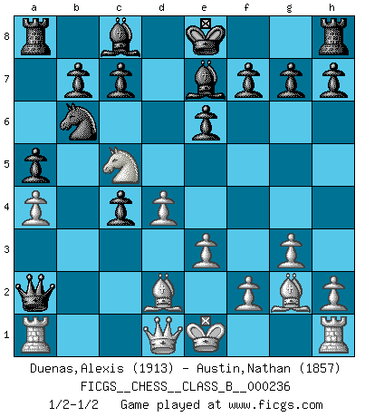 Last move : 1/2-1/2 2016 June 26 12:26:6 [Event "FICGS__CHESS__CLASS_B__000236"] [Site "FICGS"] [Date "2016.01.03"] [Round "1"] [White "Duenas,Alexis"] [Black "Austin,Nathan"] [Result "1/2-1/2"] [WhiteElo "1913"] [BlackElo "1857"] 1.d4 d5 2.c4 e6 3.Nf3 Nf6 4.g3 dxc4 5.Bg2 a6 6.Ne5 Bb4+ 7.Nc3 Nd5 8.Bd2 Nb6 9.e3 N8d7 10.Nxd7 Qxd7 11.Ne4 a5 12.a3 Be7 13.Nc5 Qb5 14.a4 Qxb2 15.Rb1 Qa2 16.Ra1 1/2-1/2 Queen's gambit declined This chess game ended in a draw. Follow this game move after move (download)I feel as if I were a piece in a game of Chess, when my opponent says of it: That piece cannot be moved. (Soren Kierkegaard) Auf Remis zu spielen ist gewissermaßen ein Verbrechen gegen das Schachspiel. (Mikhail Nekhemyevich Tal) El Ajedrez es como la guerra en un tablero. (Bobby Fischer) La vie et les Echecs sont tous les deux une lutte constante. (Lasker) A journey of a thousand sites begins with a single click. (Author unknown)