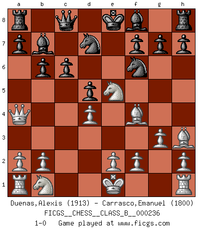 Last move : 1-0 2016 February 13 2:47:44 [Event "FICGS__CHESS__CLASS_B__000236"] [Site "FICGS"] [Date "2016.01.03"] [Round "1"] [White "Duenas,Alexis"] [Black "Carrasco,Emanuel"] [Result "1-0"] [WhiteElo "1913"] [BlackElo "1800"] 1.d4 Nf6 2.c4 e6 3.g3 d5 4.Nf3 b6 5.Bg2 Bb7 6.Ne5 Nbd7 7.Qa4 Qc8 8.cxd5 exd5 9.Bh3 c6 10.Bf4 1-0 This chess game has been lost on time (started : 2016.01.03 19:3:51) Catalan Opening Player White won this chess game. Follow this game move after move (download)The enormous mental resilience, without which no Chess player can exist, was so much taken up by Chess that he could never free his mind of this game. (Albert Einstein) Es war undenkbar für die Behörden, dass ein sowjetischer Großmeister auf diese Art und Weise [Fischer-Taimanov 6:0] verliert, ohne dass es eine politischer Erklärung dafür gäbe. (Mark Taimanov) Me gusta decir que Bobby Fischer fue el mejor jugador que jamás haya existido. Pero lo que hizo de Fischer un genio, fue su habilidad de mezclar una frescura y pragmatismo Americano con ideas Rusas acerca de la estrategia. (Bruce Pandolfini) Lorsque vous vous retrouvez devant une position atroce, ne tendez pas un ultime piège dérisoire avec l'intention d'abandonner si l'adversaire le déjoue ! Faites-vous plutôt un devoir de résister comme si votre vie en dépendait. Jouez le coup qui vous déplairait au centuple si vous étiez dans la peau de votre tortionnaire ! There are two kinds of people in the world, my friend. Those who have a loaded gun and those who dig. You dig ! (Blondie in The Good, The Bad and The Ugly)