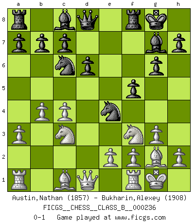 Last move : 0-1 2016 June 9 7:58:40 [Event "FICGS__CHESS__CLASS_B__000236"] [Site "FICGS"] [Date "2016.01.03"] [Round "1"] [White "Austin,Nathan"] [Black "Bukharin,Alexey"] [Result "0-1"] [WhiteElo "1857"] [BlackElo "1908"] 1.c4 d6 2.Nc3 e5 3.g3 Nc6 4.Bg2 f5 5.d3 Nf6 6.Nf3 g6 7.O-O Bg7 8.a3 O-O 9.b4 e4 10.dxe4 Nxe4 0-1 English Opening Kingside Castling by player White (move 7) Kingside Castling by player Black (move 8) Player Black won this chess game. Follow this game move after move (download)There are tough players and nice guys, and I'm a tough player. (Bobby Fischer) Jeder leidlich begabte Spieler, er braucht keineswegs hervorragend veranlagt zu sein, kann es zum Meister bringen. Aber das ist ja auch gar nicht nötig! Der richtige Standpunkt ist es, zu seinem Vergnügen zu spielen, und man glaube ja nicht, dass der Genuss proportional dem Können sei. (Siegbert Tarrasch) Si yo gano un torneo, yo lo gano por mí mismo. Yo hago las jugadas. Nadie me ayuda. (Bobby Fischer) Les échecs, c'est l'imagination. (David Bronstein) Internal peace cannot coexist with external war. (Don Groves)