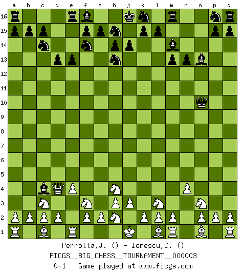 Last move : 0-1 2007 May 28 11:24:15 [Event "FICGS__BIG_CHESS__TOURNAMENT__000003"] [Site "FICGS"] [Date "2007.03.20"] [Round "1"] [White "Perrotta,John Zach"] [Black "Ionescu,Catalin"] [Result "0-1"] [WhiteElo ""] [BlackElo ""] 1.j2-h4 n15-n13 2.h1-o7 j15-h13 3.o7-o15 g16-f14 4.o15-c4 b16-c14 5.b1-c3 e15-e13 6.g1-f3 h16-o10 7.p1-o3 m15-m13 8.k1-l3 d15-d13 9.n2-n4 l16-o13 10.e2-e4 c16-j10 11.c4-d4 o16-m14 12.f1-c4 j10-c4 0-1 This big chess game has been lost on time (started : 2007.03.20 13:28:58) Follow this game move after move (download)A chess genius has died; a loss for humanity. (Viktor Kortchnoi, about Bobby Fischer's death) Meine Liebe ist Schach, Schach, Schach. Ich muss jeden Tag Schach spielen, deshalb fühle ich mich so stark. (Miguel Najdorf) Debemos de asegurarnos de que el Ajedrez no se convierta en un lenguaje muerto, muy interesante, pero solo para un grupo muy pequeño. (Sytze Faber) Les échecs sont utiles à l'exercice de la faculté de penser et à celle de l'imagination. Car nous devons posséder une méthode élaborée pour atteindre des buts partout où nous devons conduire notre raison. (Leibnitz) Gambling is the son of avarice and the father of despair. (French proverb)