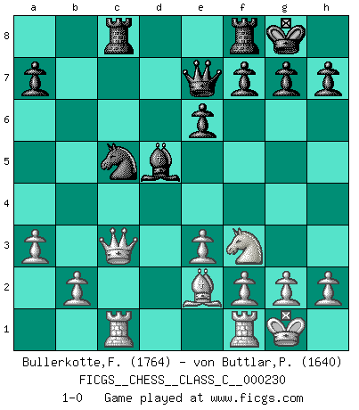 Last move : 1-0 2016 July 9 1:2:57 [Event "FICGS__CHESS__CLASS_C__000230"] [Site "FICGS"] [Date "2016.01.04"] [Round "1"] [White "Bullerkotte,Frank"] [Black "von Buttlar,Paul"] [Result "1-0"] [WhiteElo "1764"] [BlackElo "1640"] 1.d4 d5 2.c4 e6 3.Nc3 c6 4.Nf3 Nf6 5.Bg5 Be7 6.e3 Ne4 7.Bxe7 Qxe7 8.Qc2 Nd7 9.a3 Nxc3 10.Qxc3 O-O 11.Bd3 dxc4 12.Bxc4 b5 13.Be2 Bb7 14.O-O c5 15.dxc5 Nxc5 16.Bxb5 Rac8 17.Be2 Bd5 18.Rac1 1-0 This chess game has been lost on time (started : 2016.01.04 10:7:18) QGD : Semi-Slav Kingside Castling by player Black (move 10) Kingside Castling by player White (move 14) Player White won this chess game. Follow this game move after move (download)What is the object of playing a gambit opening?... To acquire a reputation of being a dashing player at the cost of losing a game. (Siegbert Tarrasch) Glücklicherweise sind Großmeister Ruben Fines reine Schachbücher weniger phallozentrisch [als seine Schachpsychologie] und deswegen auch weniger lächerlich. (Nigel Short) Una mala movida nulifica cuarenta buenas. (Horowitz) Le profane ne songe pas à la somme de jouissance dont il se prive, qui méconnaît ce jeu aux ressources aussi variées que passionnantes. (Jean-Marie Jeanton-Lamarche) Fortune favours the audacious. (Desiderius Erasmus)