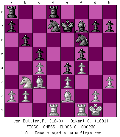 Last move : 1-0 2016 April 4 19:10:35 [Event "FICGS__CHESS__CLASS_C__000230"] [Site "FICGS"] [Date "2016.01.04"] [Round "1"] [White "von Buttlar,Paul"] [Black "Dikant,Christophe"] [Result "1-0"] [WhiteElo "1640"] [BlackElo "1691"] 1.c4 e5 2.Nc3 d6 3.e3 f5 4.Nf3 Nf6 5.d4 e4 6.Nd2 c5 7.Nb3 Be7 8.dxc5 dxc5 9.Qxd8+ Kxd8 10.Bd2 Be6 11.Rc1 b6 12.Ne2 Bf7 13.Nc3 Nbd7 14.Be2 Bd6 15.O-O Be5 16.f4 Bxc3 17.Bxc3 Ke7 18.Rcd1 Rhd8 19.h3 1-0 English Opening Kingside Castling by player White (move 15) Player White won this chess game. Follow this game move after move (download)I believe that Chess possesses a magic that is also a help in advanced age. A rheumatic knee is forgotten during a game of Chess and other events can seem quite unimportant in comparison with a catastrophe on the chessboard. (Vlastimil Hort) Sie bekommen vielleicht den Eindruck, dass die Spitzenspieler überhaupt gar nicht so stark sind. Aber das stimmt nicht. Es ist eine Illusion. Mit einem Computer an der Seite ist es sehr leicht, Urteile zu fällen, aber wenn man alleine am Brett sitzt, sieht die Sache ganz anders aus. (Vladimir Kramnik) El Ajedrez es realmente noventa y nueve por ciento calculación. (Soltis) Les échecs sont plus proches de l'art de l'assassinat que de l'art de la guerre. (Arturo Perez-Reverte) I live to kill Traxler counterattack. (Ilmars Cirulis)