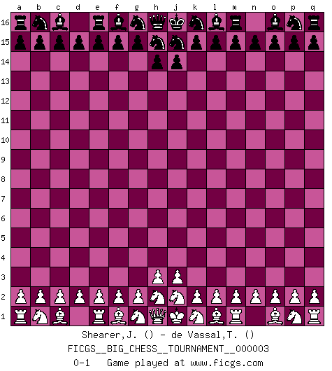 Last move : 0-1 2007 April 19 17:48:27 [Event "FICGS__BIG_CHESS__TOURNAMENT__000003"] [Site "FICGS"] [Date "2007.03.20"] [Round "1"] [White "Shearer,Joseph"] [Black "de Vassal,Thibault"] [Result "0-1"] [WhiteElo ""] [BlackElo ""] 0-1 This big chess game has been lost on time (started : 2007.03.20 13:28:58) Follow this game move after move (download)Alekhine is a poet who creates a work of art out of something that would hardly inspire another man to send home a picture post card. (Max Euwe) Um dein Spiel zu verbessern musst du zuallererst das Endspiel studieren, denn diese kann unabhängig studiert werden. Die Eröffnung und das Mittelspiel müssen immer in Bezug gesetzt werden zum Endspiel. (José Raúl Capablanca) Fischer es el jugador mas fuerte del mundo. De hecho, el jugador mas fuerte que jamas haya existido. (Larry Evans) La tactique est l'élément le plus important du milieu de jeu. (Siegbert Tarrasch) Life doesn't imitate art, it imitates bad television. (Woody Allen)